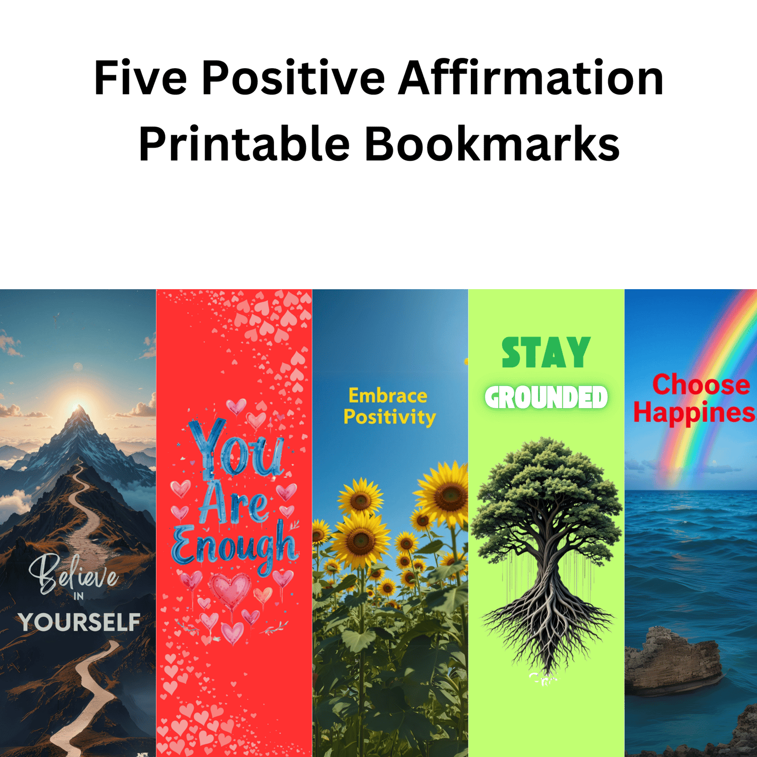 experience with our set of 5 beautifully designed affirmation bookmarks. Each bookmark features a unique, uplifting message accompanied by stunning imagery. Perfect for daily inspiration, these bookmarks will remind you to believe in yourself, embrace positivity, and choose happiness with every turn of the page. Ideal for book lovers and anyone seeking a boost of motivation! Download PNG and PDF