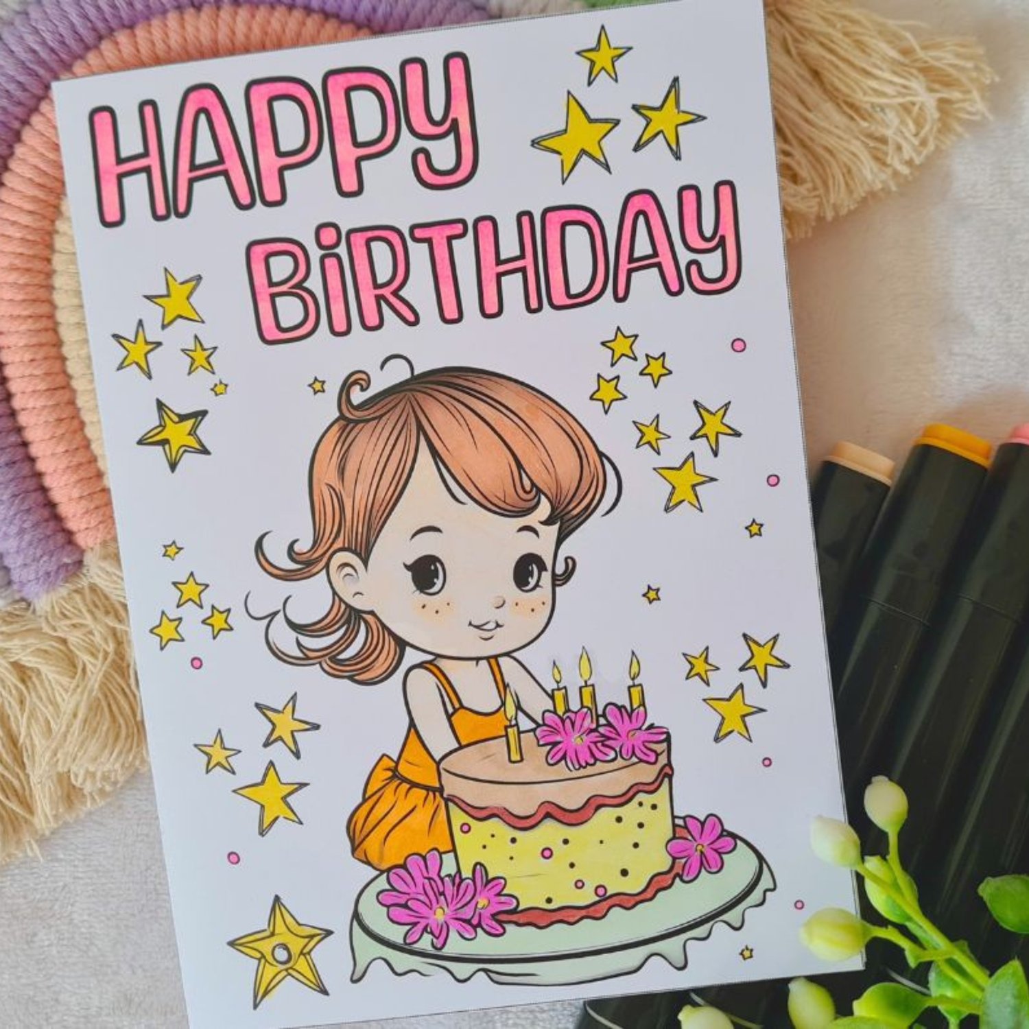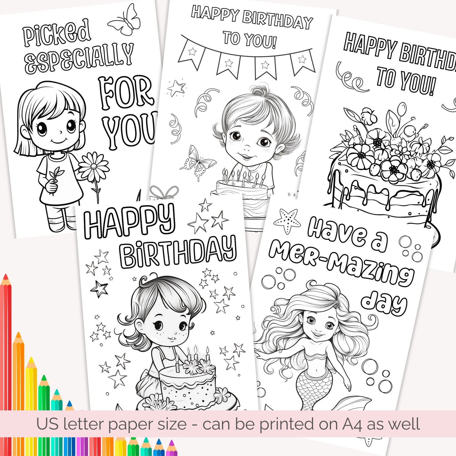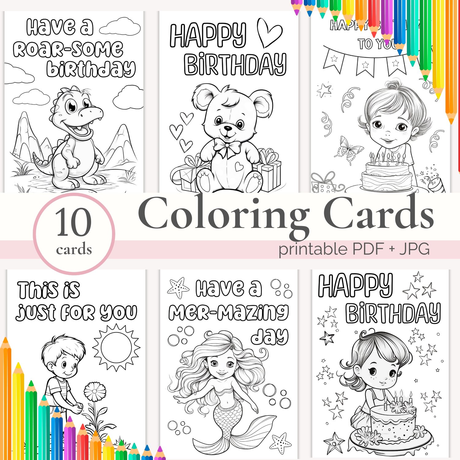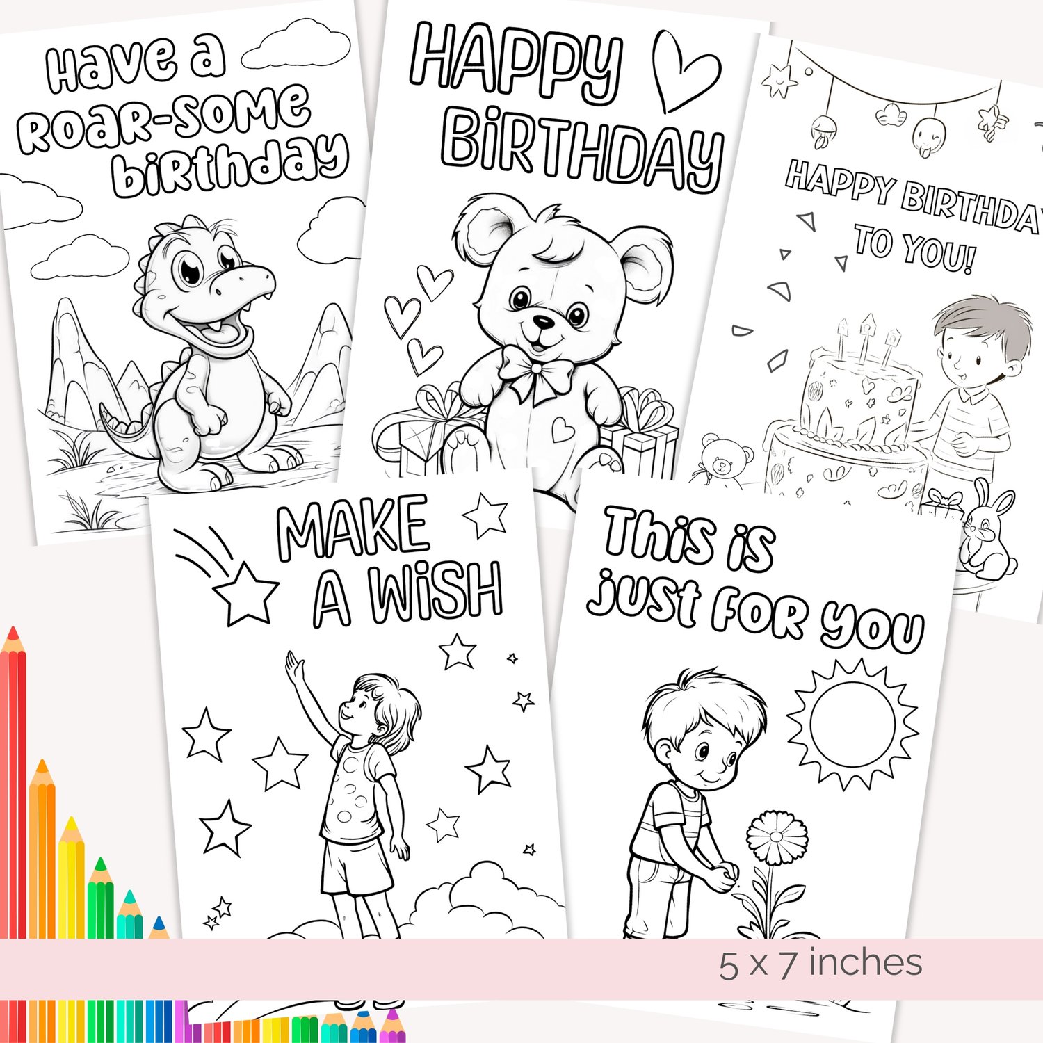 Make birthday cards unique with this coloring happy birthday cards bundle for boys and girls! Coloring is fun crafting activity for kids and adults, so make your next birthday wishes card a fun project for the whole family! You'll have fun and birthday cards always in hand.Â