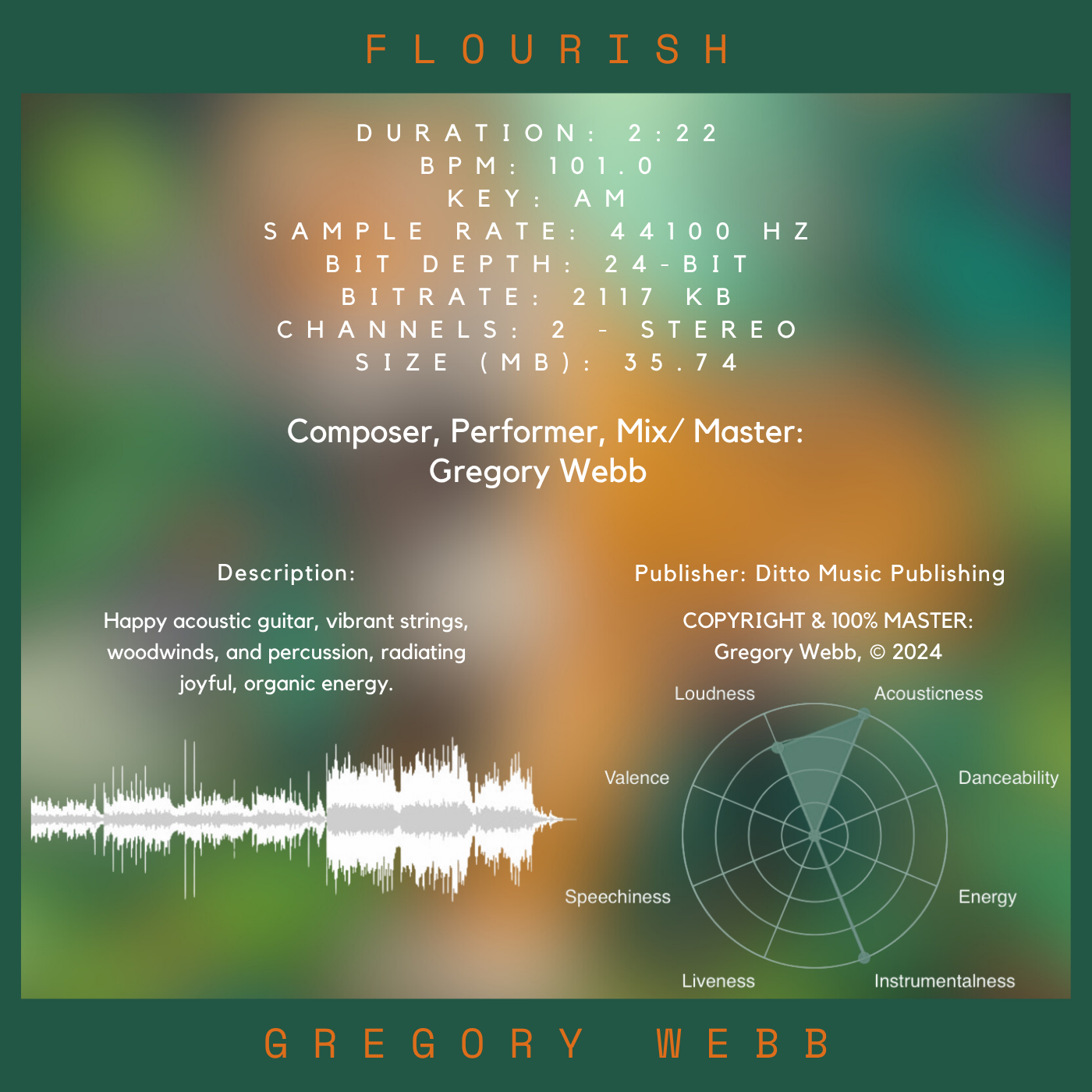 A happy, organic theme with acoustic guitar, vibrant strings, woodwinds, and lively percussion. The joyful tone evokes blooming landscapes or celebratory moments.