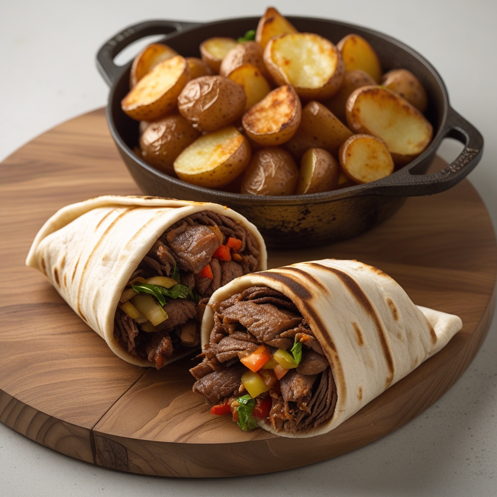 A crispy, golden-brown shawarma wrap, sliced in half, rests on a wooden board alongside a generous serving of fried potatoes, cooked to a golden crisp in a rustic, cast-iron cookware, with a subtle sheen of oil, set against a clean, neutral background, with the shawarma's juicy meat and crunchy vegetables spilling out, invitingly lit to accentuate the textures and warmth of the dish, evoking the aroma of a bustling street food market.