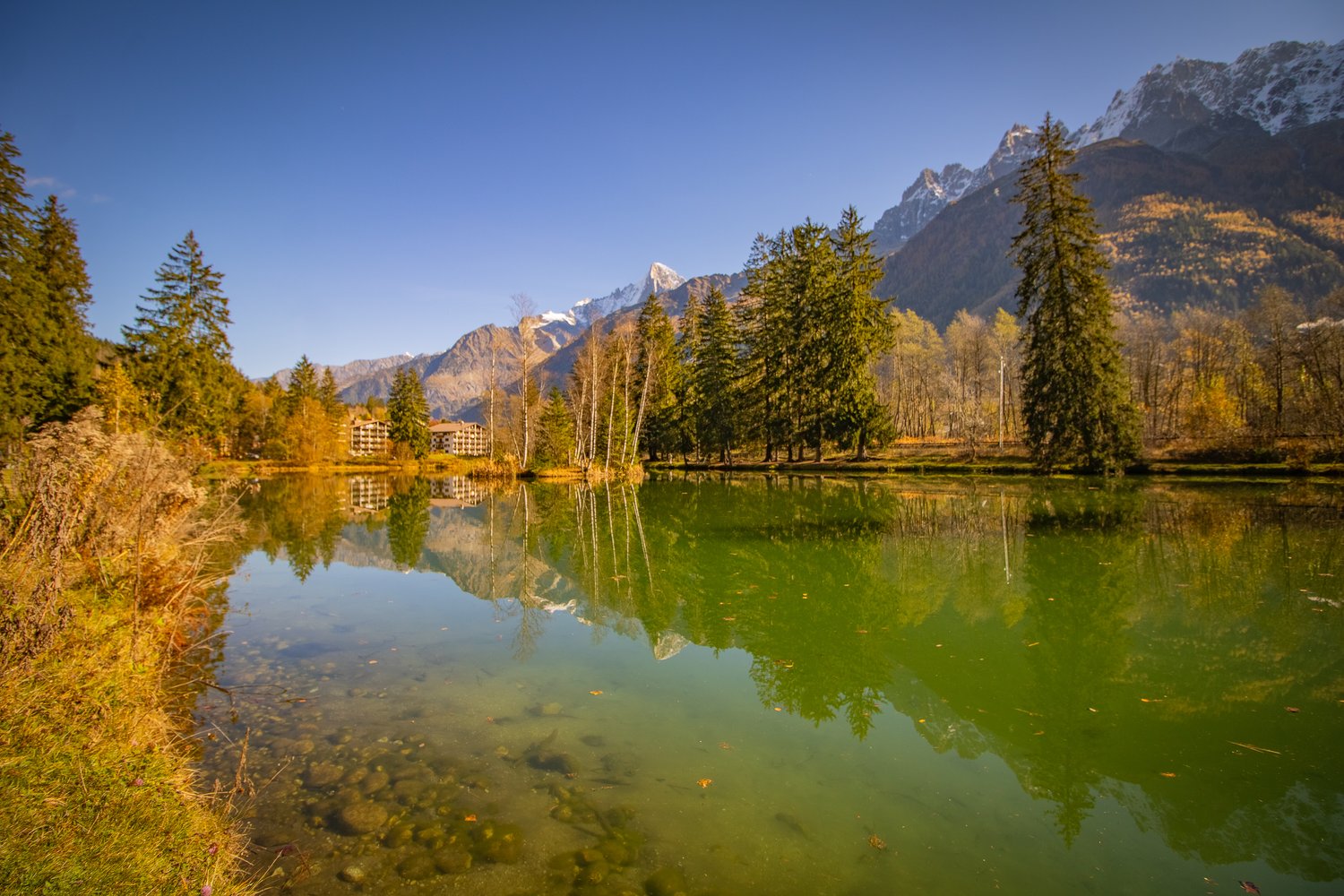 This photograph shows a still alpine lake reflecting trees and mountains dressed in autumn colour. Golds and greens soften the landscape, while the water mirrors the scene with quiet clarity.