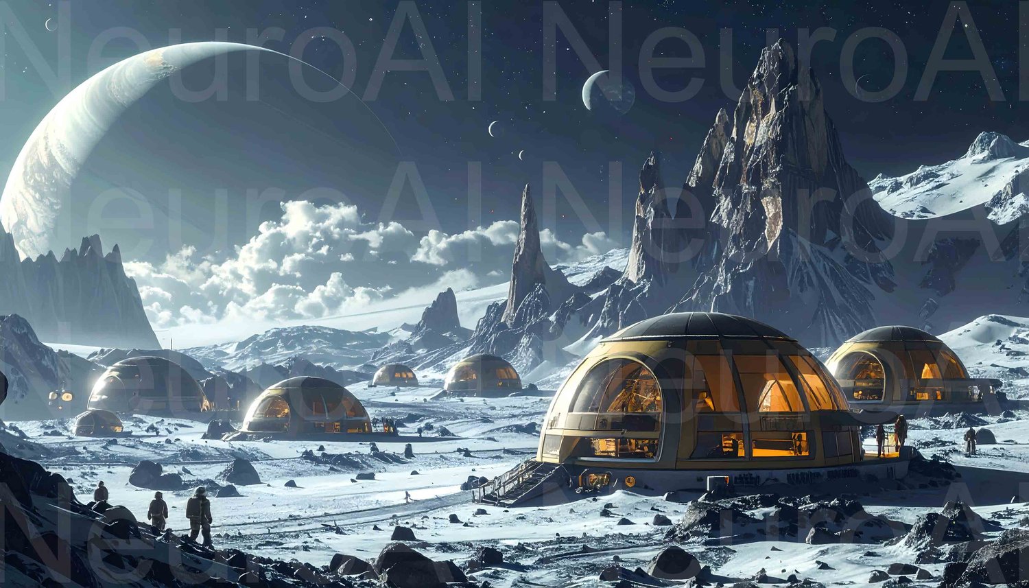 Explore futuristic lunar colony with mountain views