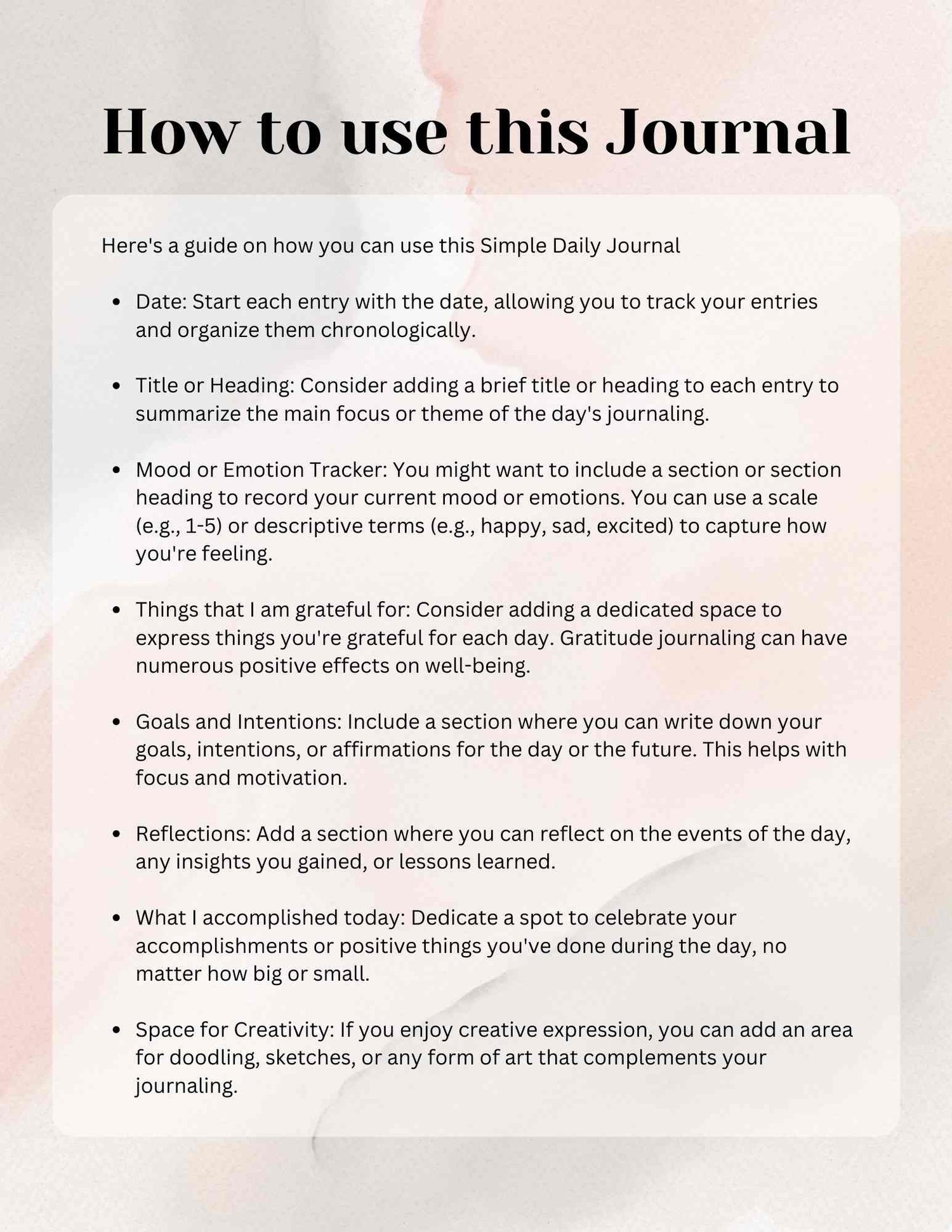 - Printable Format: Conveniently print your journal pages at home or at a local print shop, making it easy to start journaling right away.