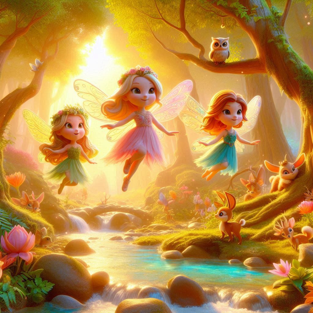 Three fairy friends go on an adventure around their home in a magical forest and meet new friends along the way