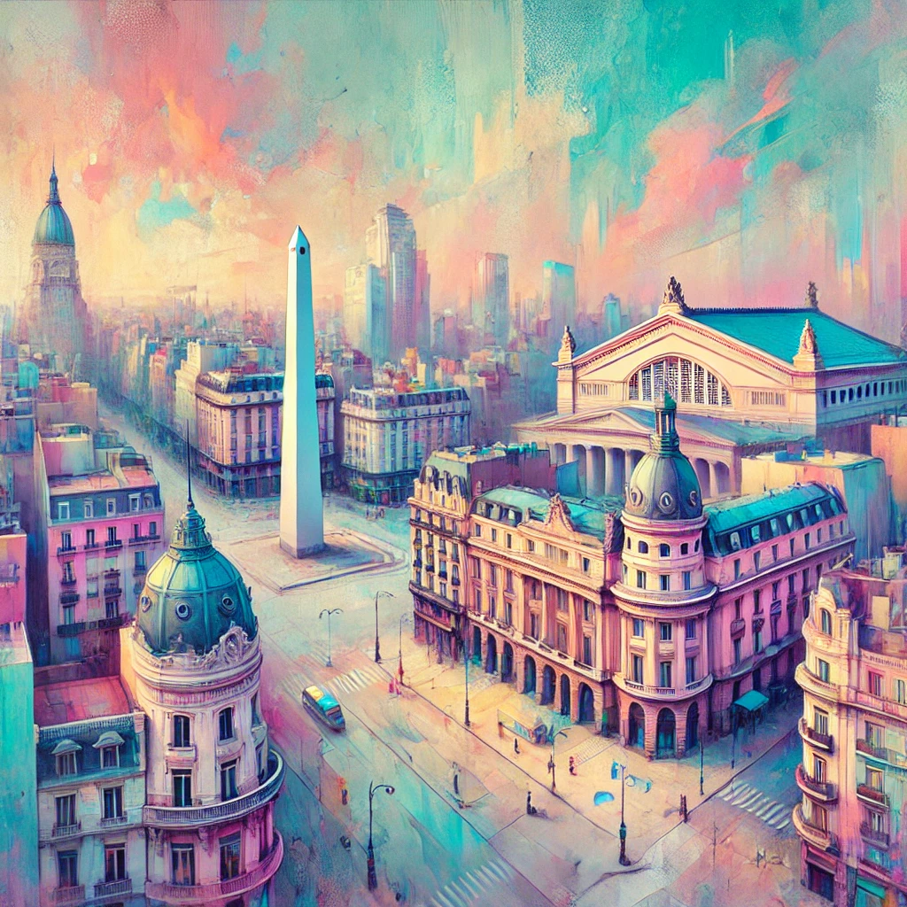 This enchanting vision of Buenos Aires captures the city's rich cultural soul, where European-inspired architecture, vibrant streets, and the passion of tango merge into a dreamy masterpiece. The colorful facades of La Boca, the grandeur of Teatro Colón, and the iconic Obelisk stand bathed in a soft, pastel glow. A fusion of warm oranges, deep blues, and gentle pinks reflects the rhythm of the city’s heartbeat, creating a surreal yet nostalgic atmosphere. This piece transforms Buenos Aires into a romantic dreamscape, a perfect blend of history, music, and art.
