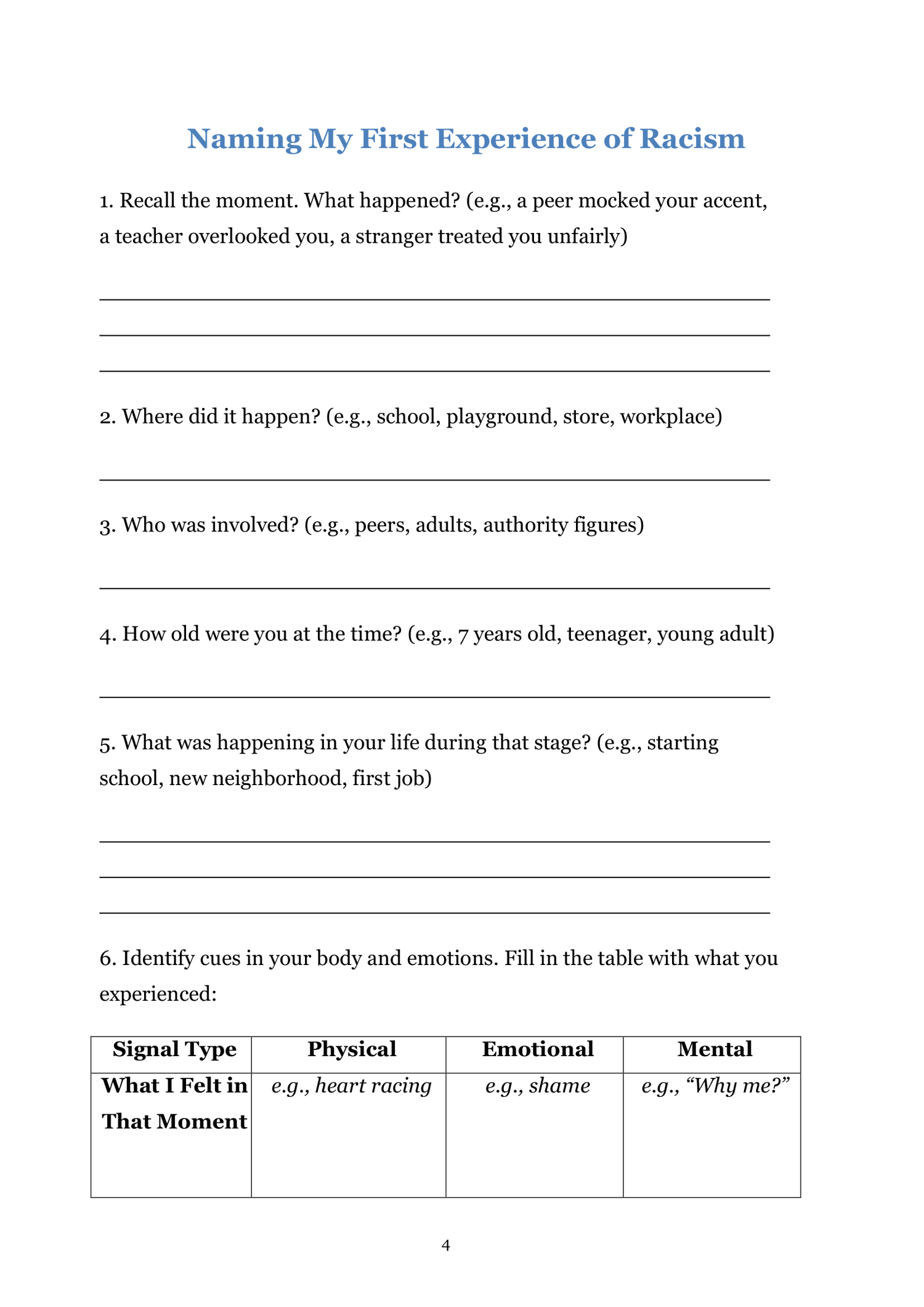 - Offer guided prompts to name, validate, and process racial trauma