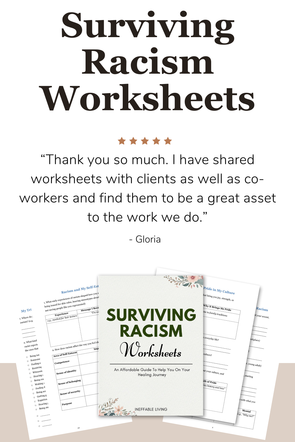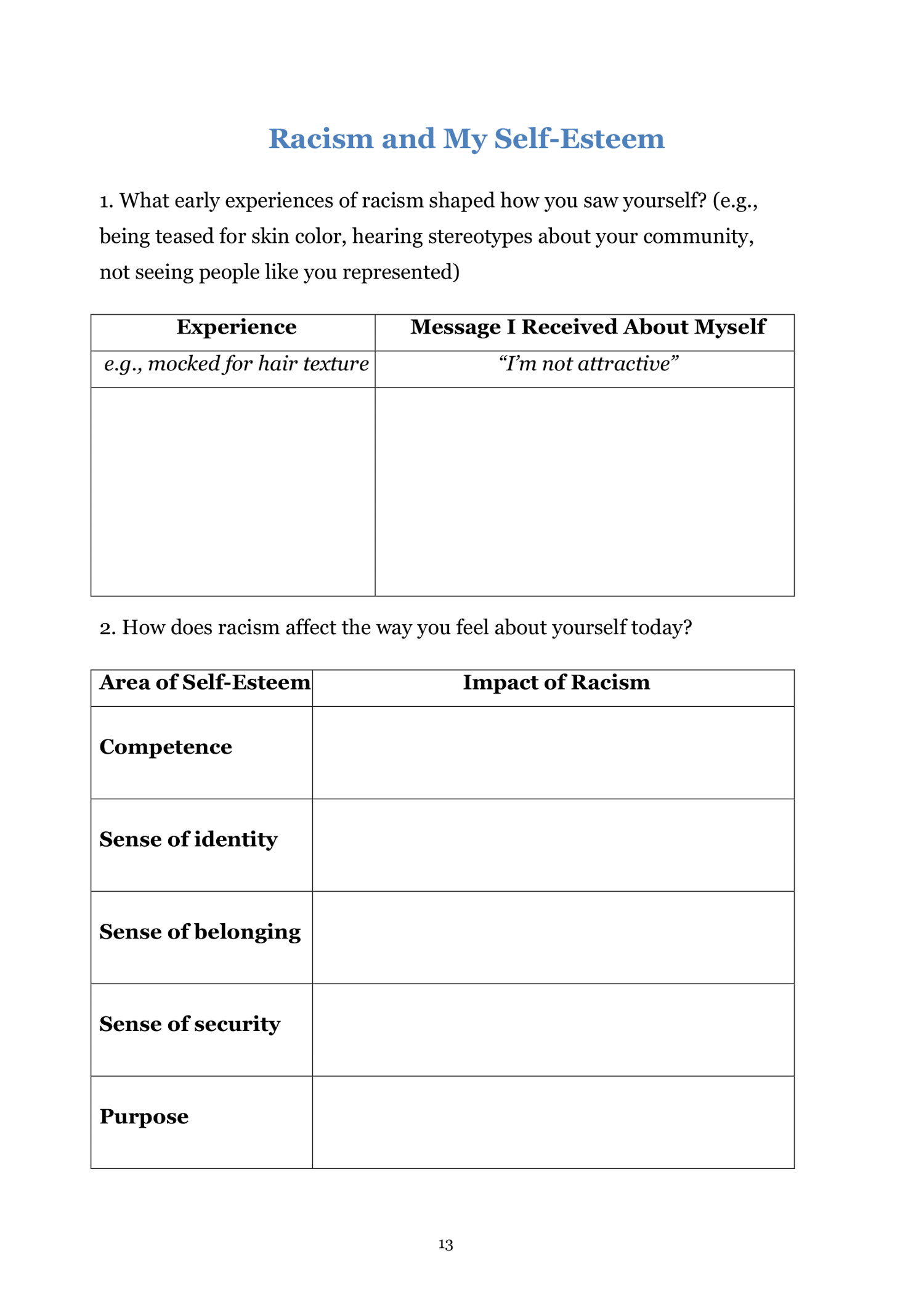 If so, the Surviving Racism Worksheets are designed to help you process your pain, affirm your truth, and build inner strength in the face of injustice.