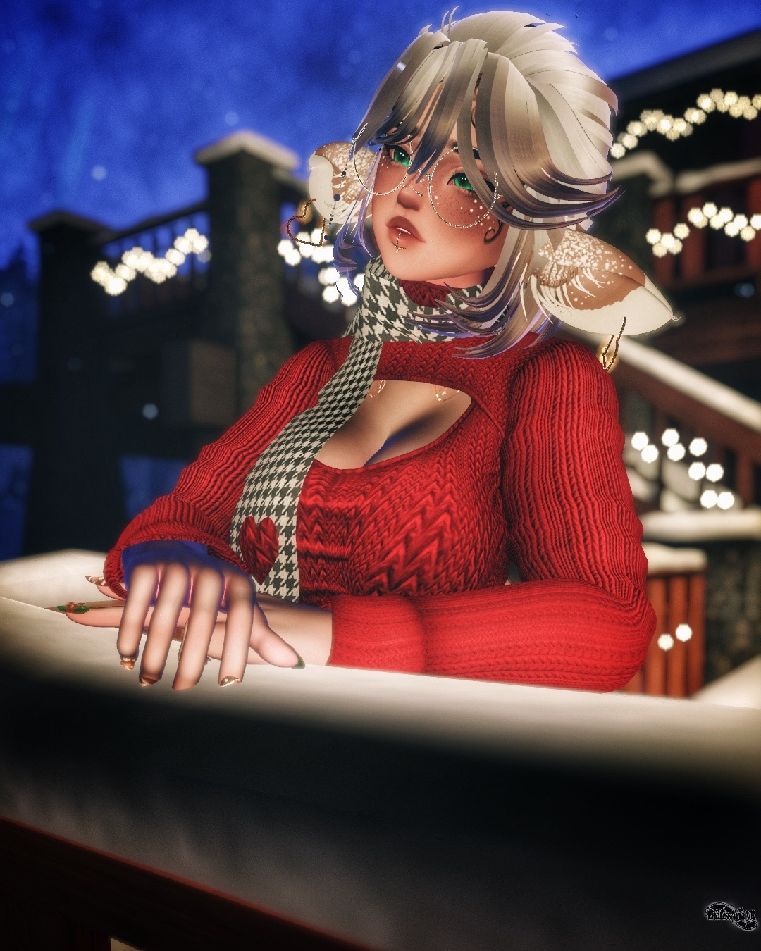 Head (sculpted) - Face Texture - Face Decal (custom) - Body (sculpted) - Tattoos - Hair 1 - Hair 2 - Hair 3 - Hair 4 - Hair 5 - Hair 6 - Deer Ears and Tail - Santa Dress & Acc’s - Ribbon Outfit - Bodysuit - Sweater - Windowed Sweater - Underboob Top & Skirt w/ Lingerie - Jeans - Ripped Tee & Shorts - Boots - Pearl Heels - Heart Earrings - Jelly Cat - Scarf & Leg Warmers - Pasties - Glasses - Antler Headband - Nose Chain - Nails - Teardrop Jewelry - AFK Pose