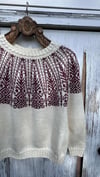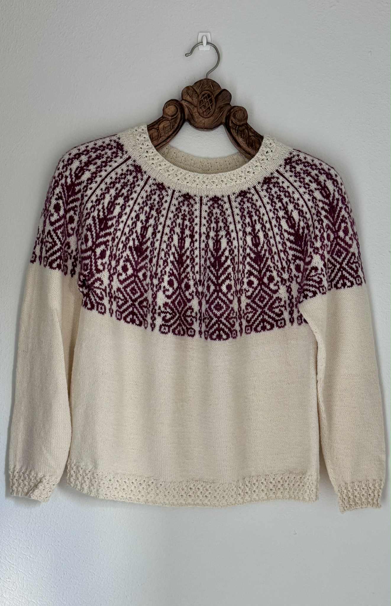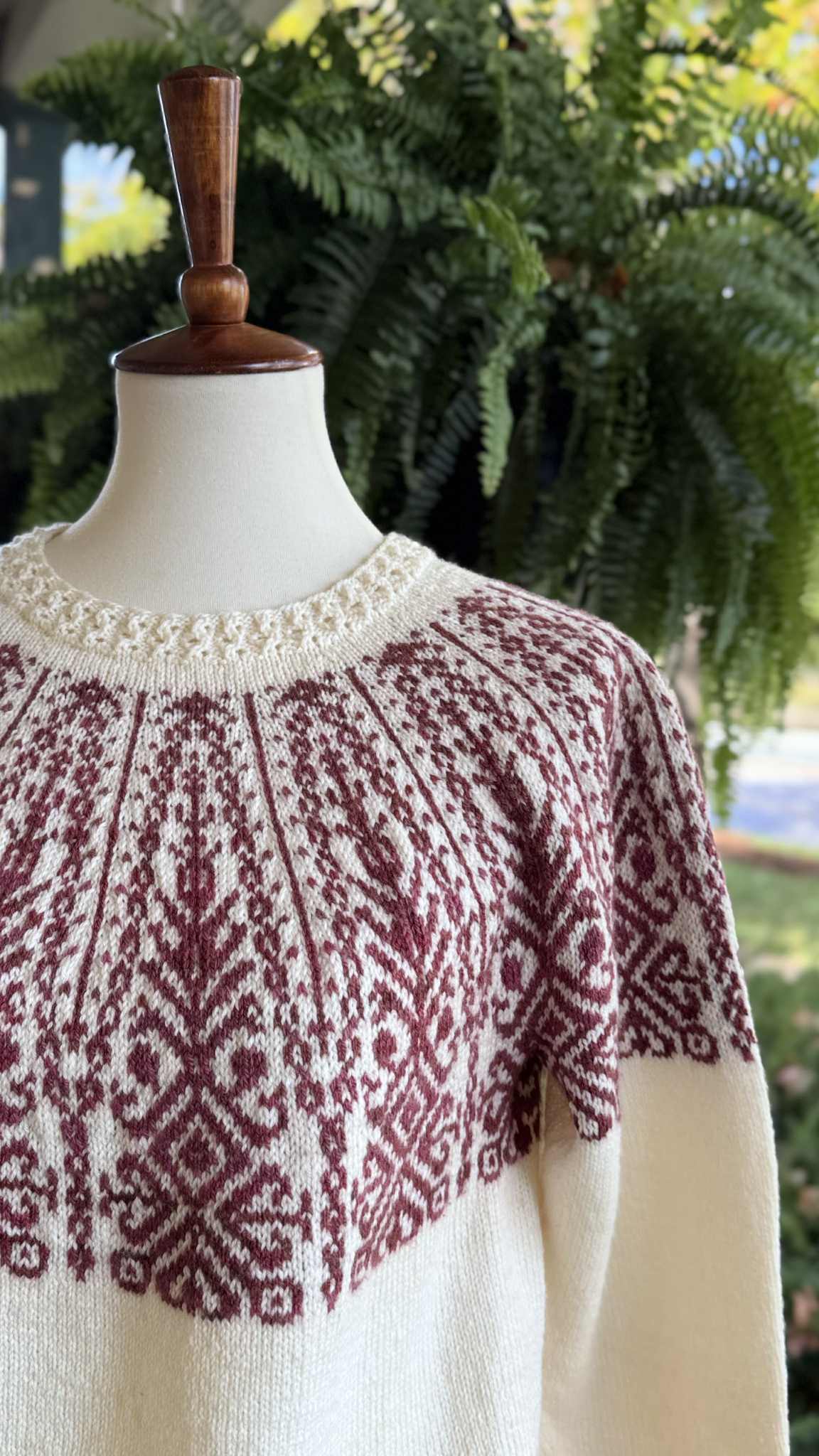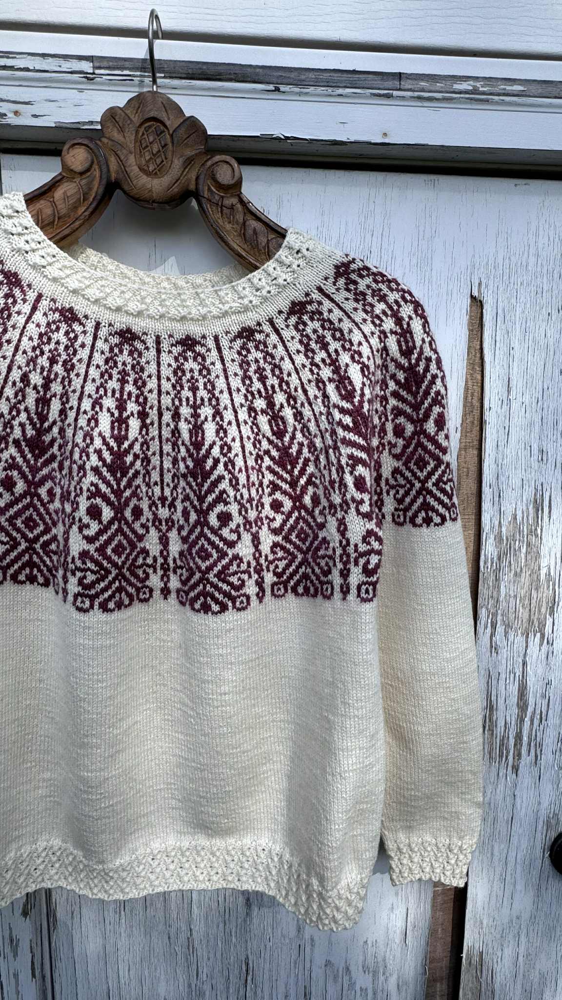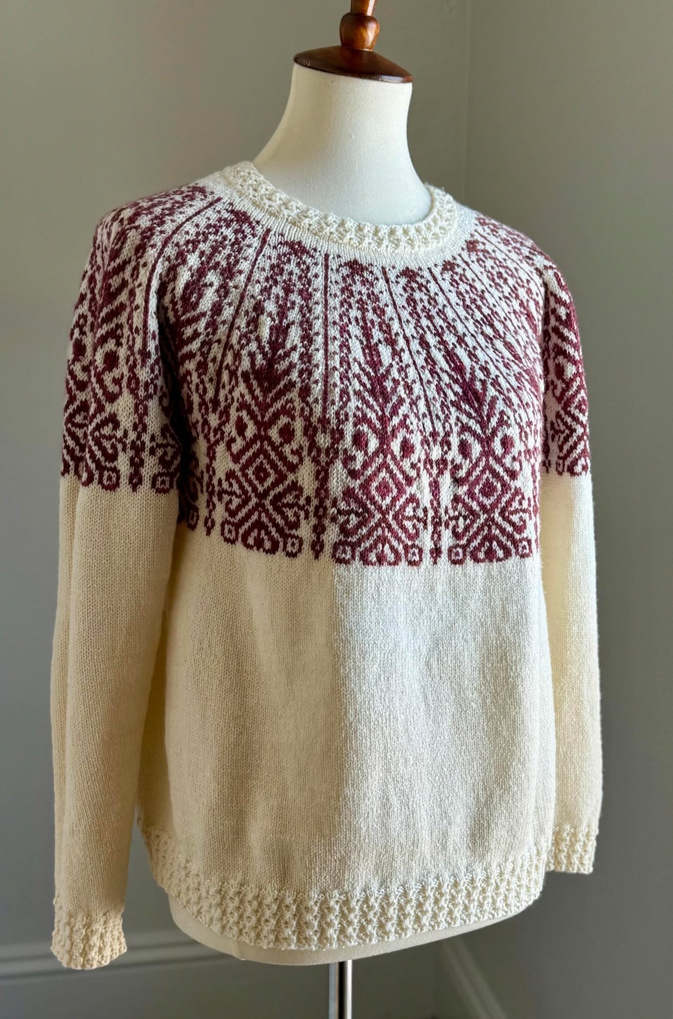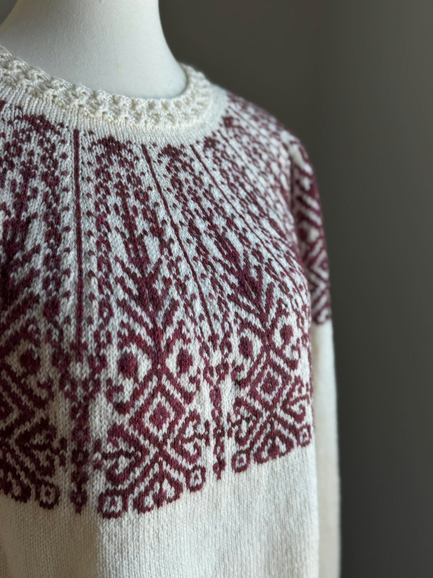 This design is perfect for those who love classic silhouettes with modern charm. The body and sleeves are plain stockinette to let the yoke shine, finished with a subtle textured rib on the neckline, cuffs, and hem.
