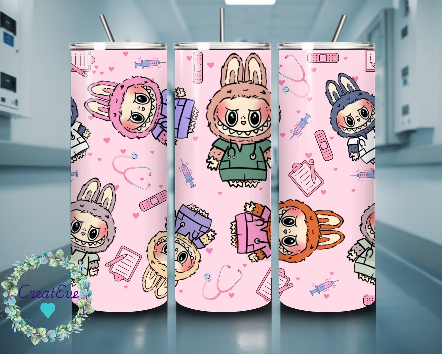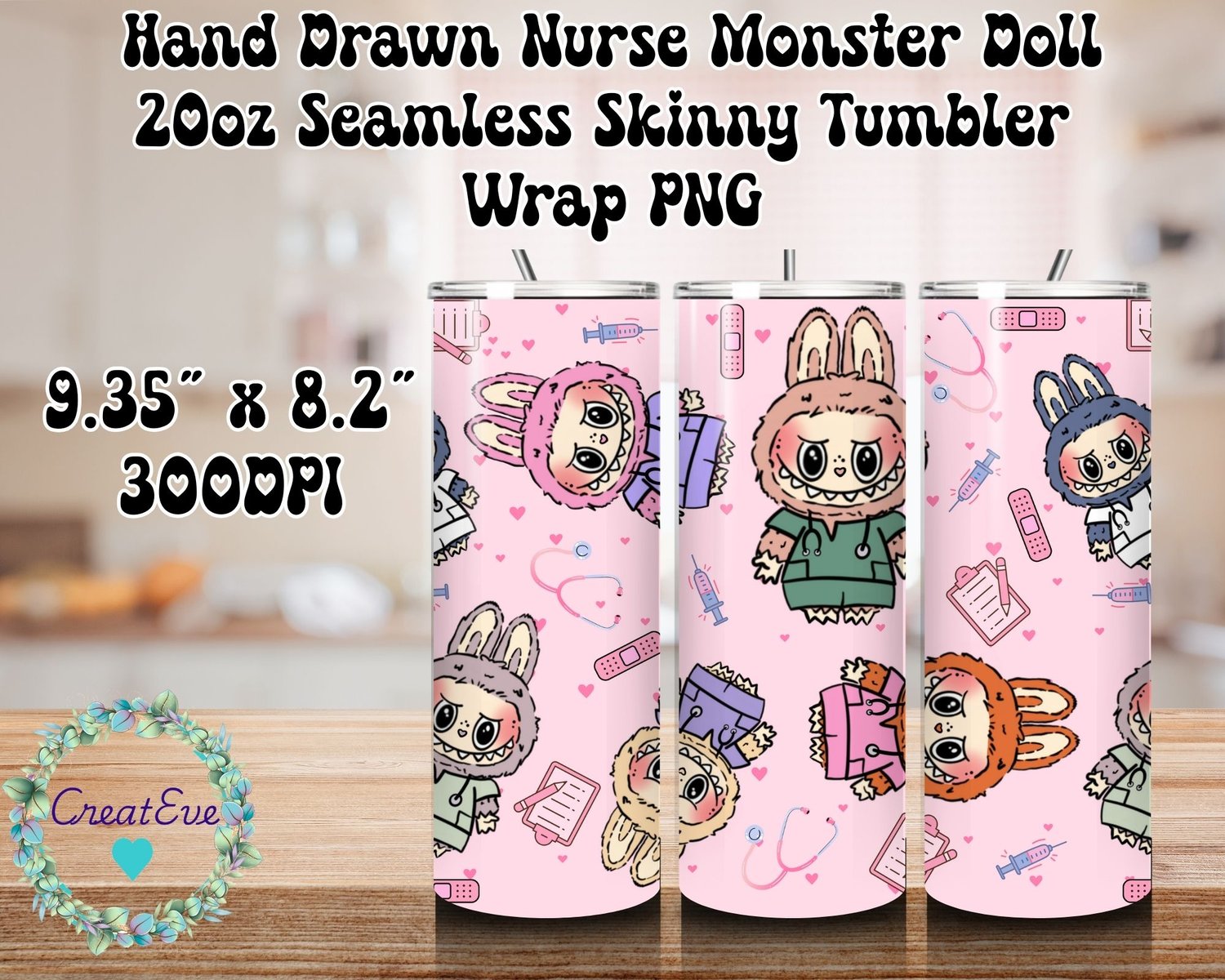 Hand Drawn Nurse Monster Doll Seamless 20oz Skinny Tumbler PNG
