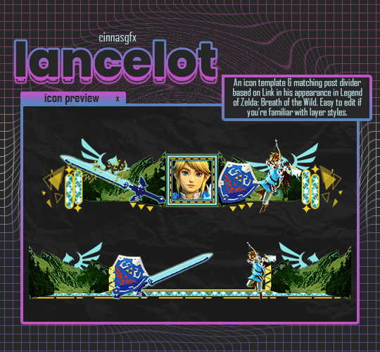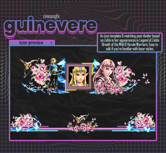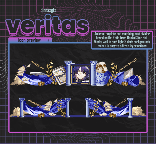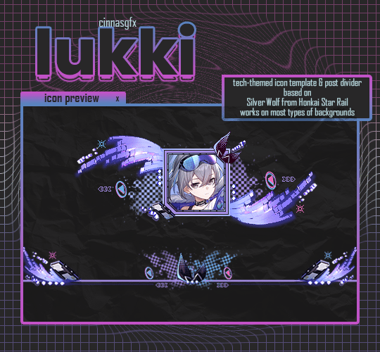 An icon template & post divider based on Silver Wolf from Honkai Star Rail, as requested by anonymous on tumblr. There's no blockquotes, but it should be wide enough to cover the post width. The image used in the preview is not included with the psd file. Easy to edit if you're familiar with the following: layer styles and layer masks.
