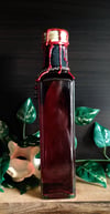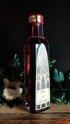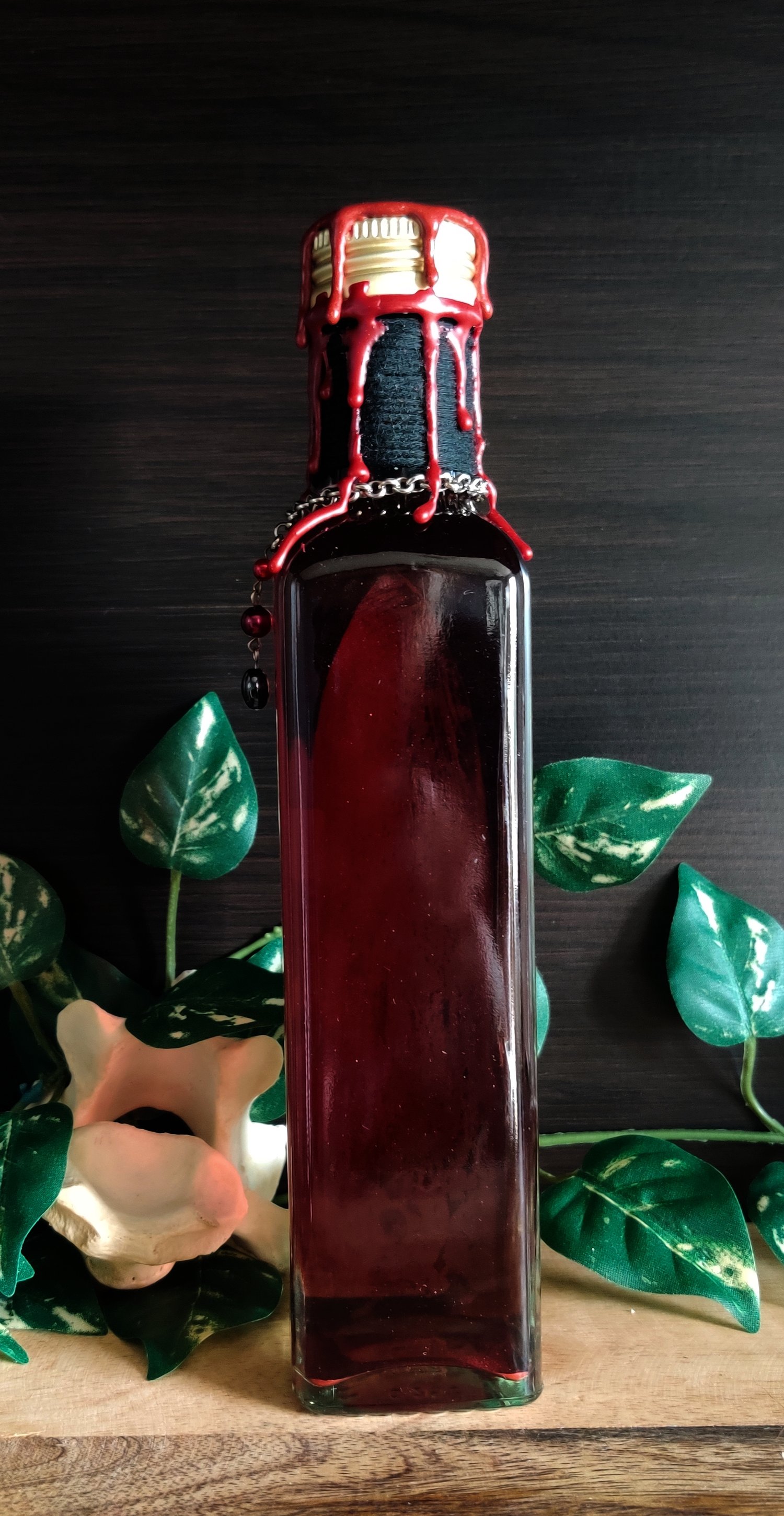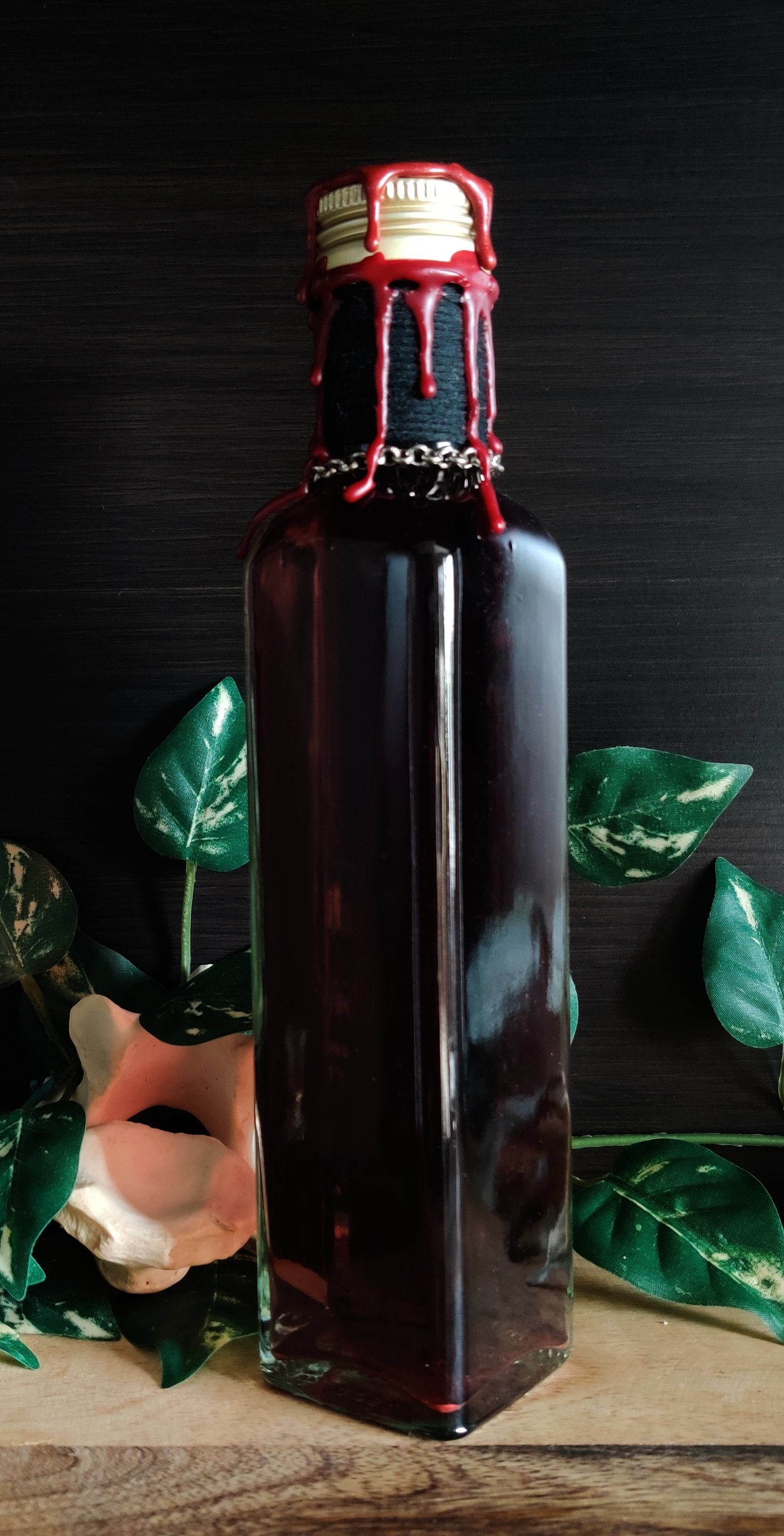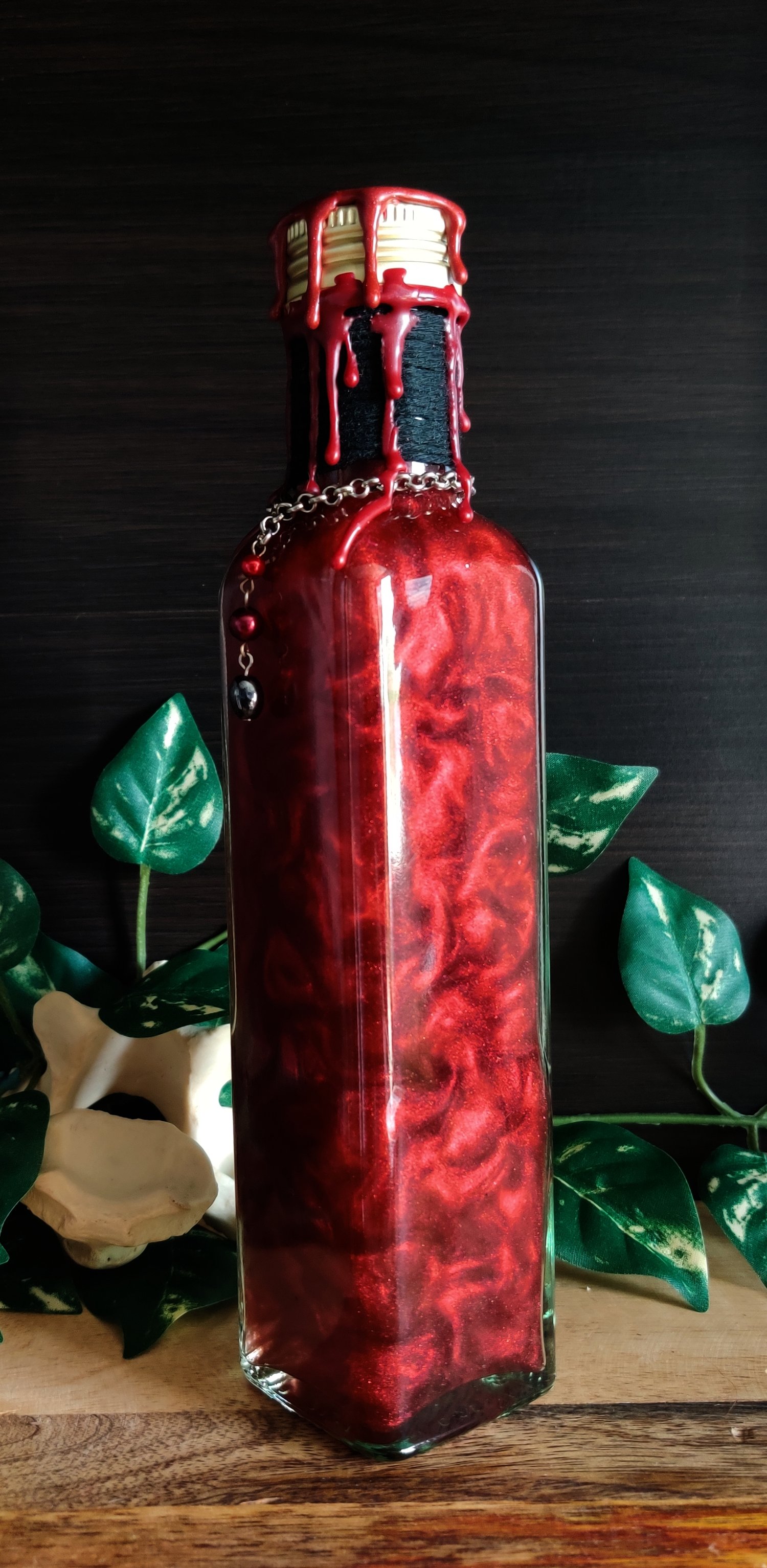 Pullossa on mustanpunaista nestettä ja se on koristeltu käsintehdyllä etiketillä, nauhalla sekä helmiyksityiskohdalla.