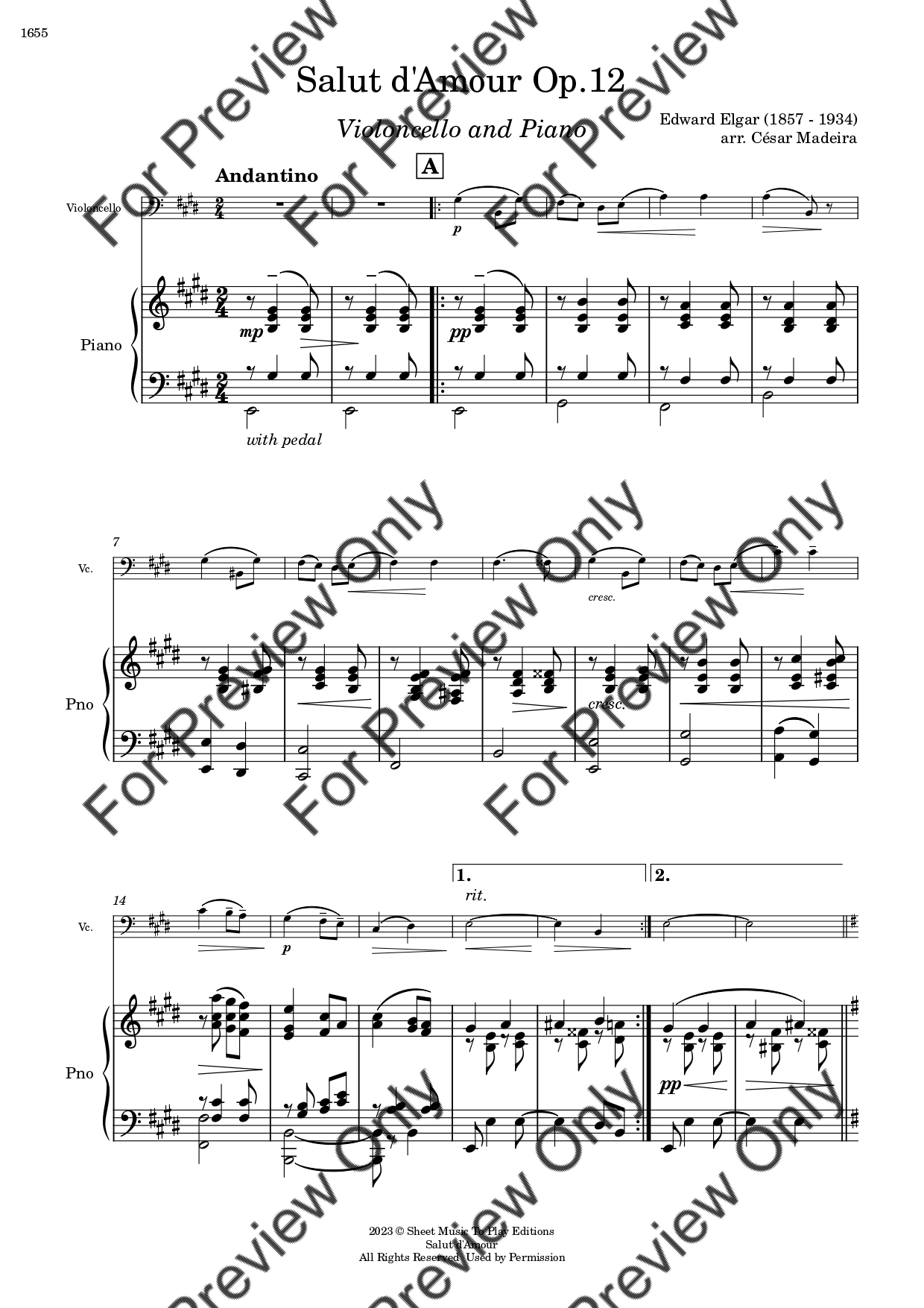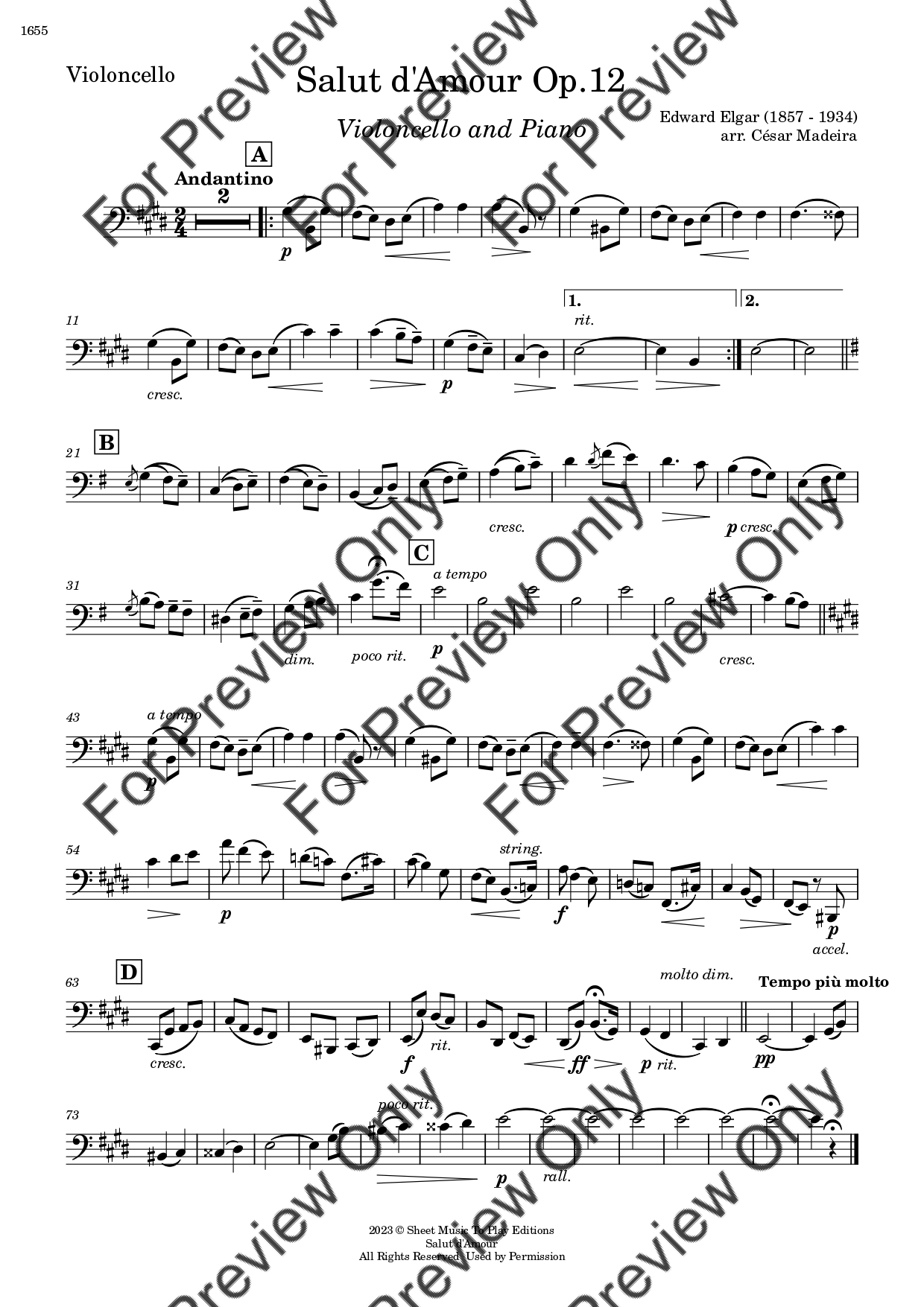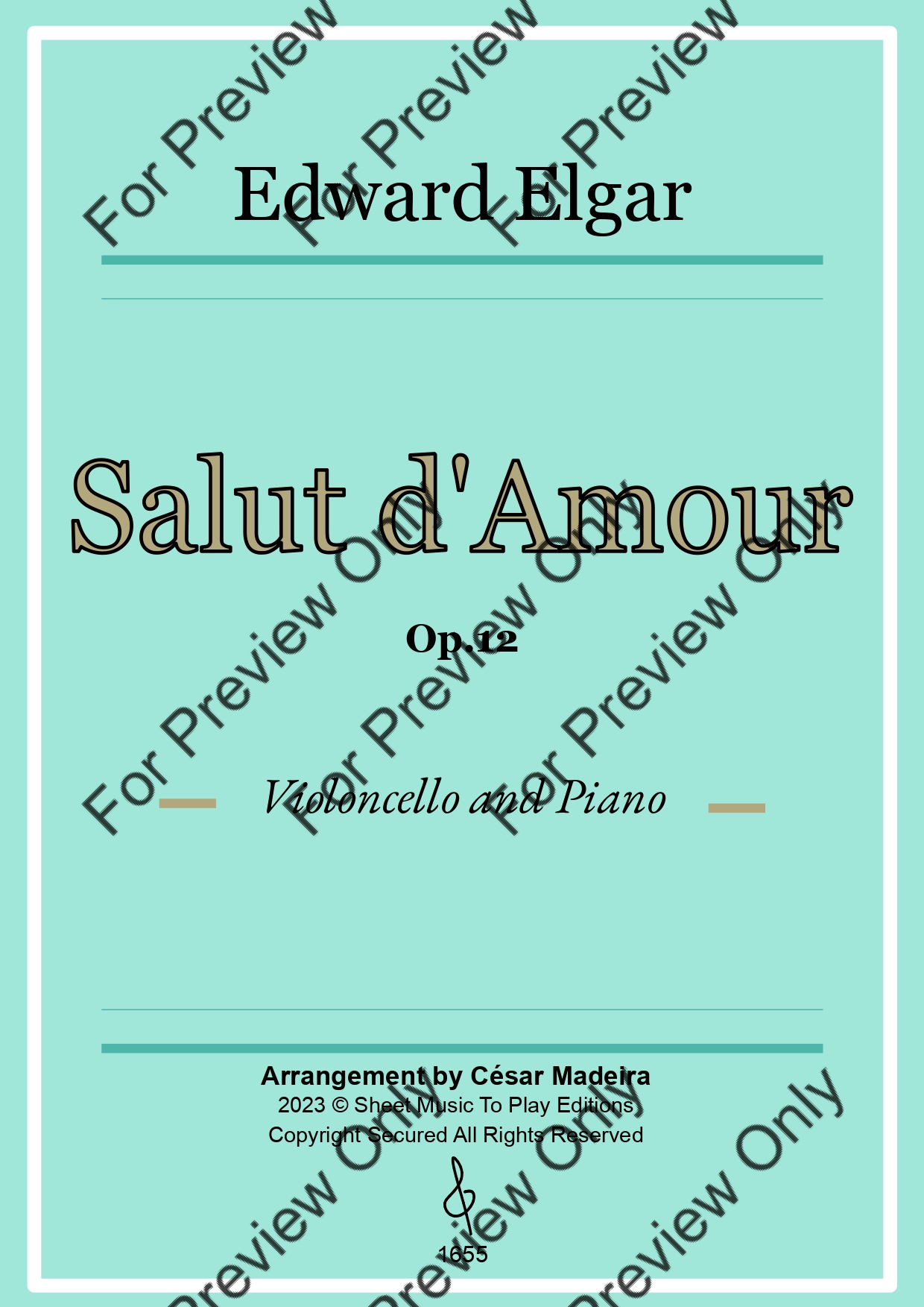 Salut d'Amour, Op.12 by Edward Elgar. Arrangement for Violoncello and Piano. With Full Score and Individual Parts. Have fun!