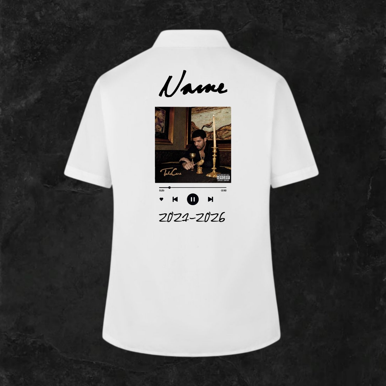 A modern, music-player–style leavers shirt inspired by Drake. Featuring a personalised name, a custom album or song cover displayed in a clean player layout, and your leavers years underneath, this design is perfect for music lovers who want something stylish, nostalgic, and personal.