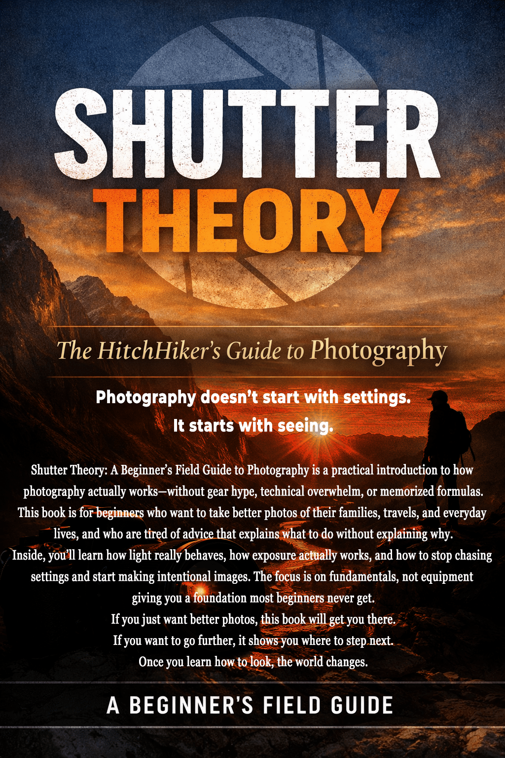 Shutter Theory: A Beginner’s Field Guide to Photography is not a checklist of camera settings or a gear-buying manual. It’s a practical, experience-driven introduction to how photography actually works, written for people who want their photos to make sense, not just look accidental.