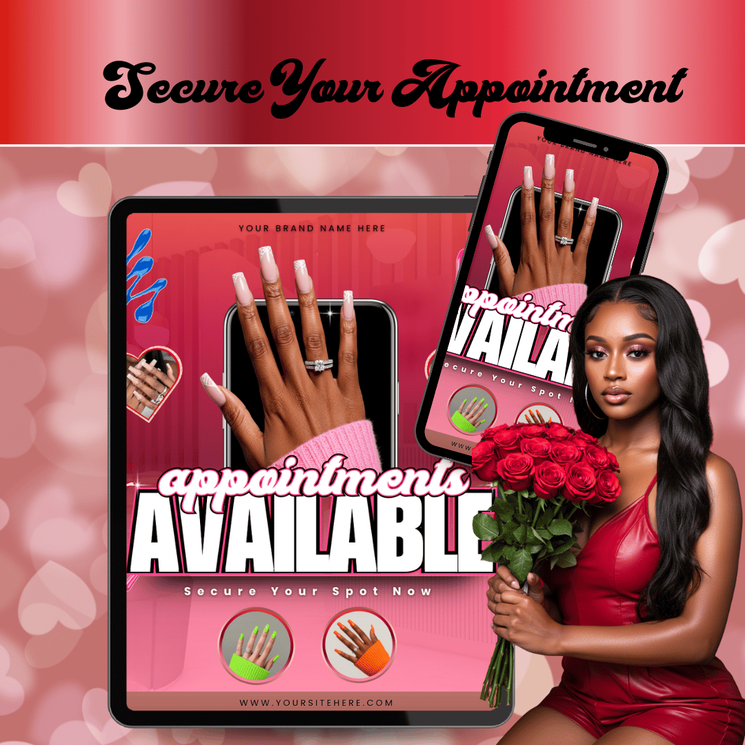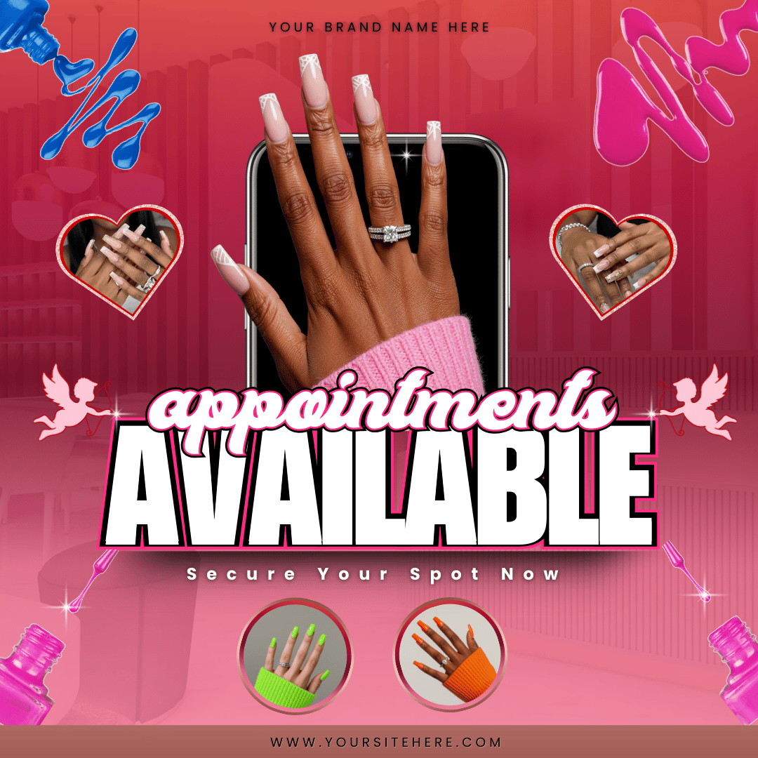 Make booking a breeze with this stunning nail appointment flyer template! Featuring bold red and pink Valentine’s Day vibes, this editable Canva template is perfect for promoting your nail services in style.
