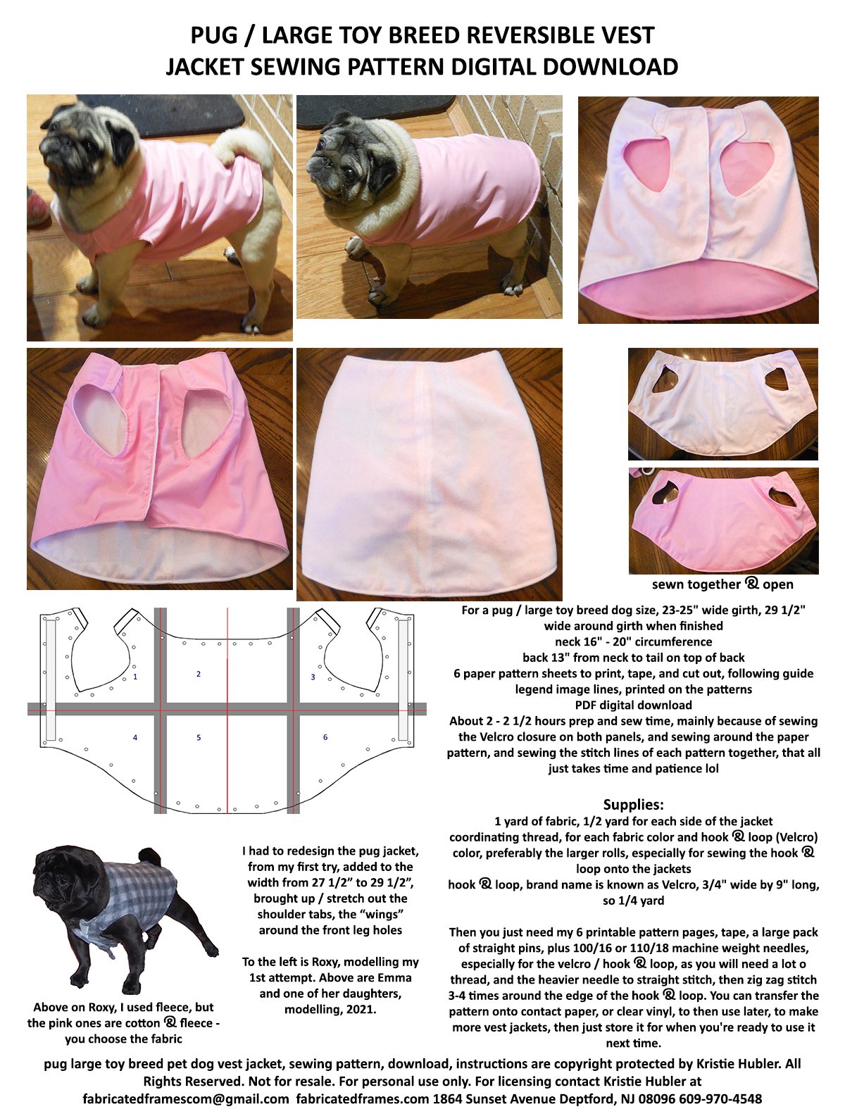 pug large toy breed pet dog vest jacket, sewing pattern, download, instructions are copyright protected by Kristie Hubler. All Rights Reserved. Not for resale. For personal use only. For licensing contact fabricatedframescom at gmail dot com
