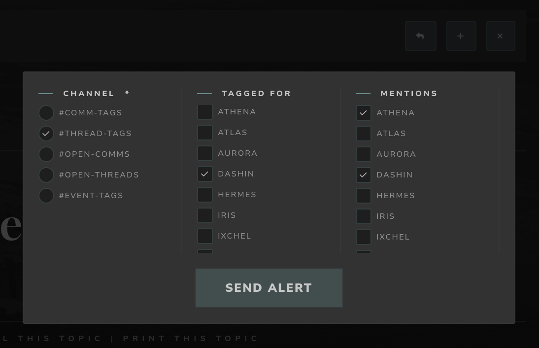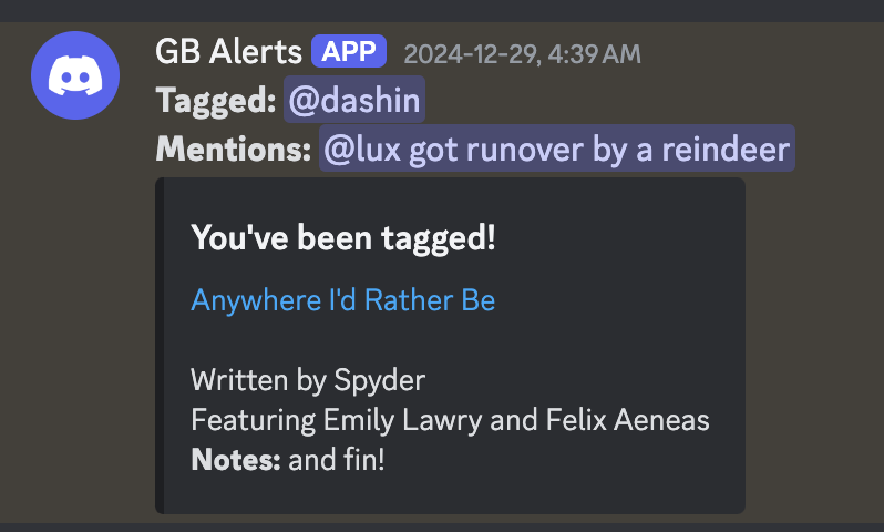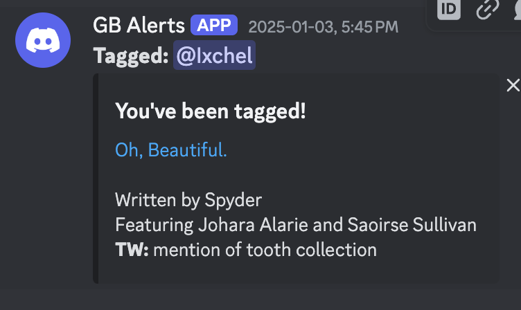 A scripted Discord Tagging System which auto-grabs the account names, the writer of the last post, the trigger warnings from the last post, and any notes from the last post and allows tagging to specific channels, multiple members, and mentioning other members who have characters mentioned in the thread. The tag does not send automatically on submission of the post, allowing for your members to fully customize which members are tagged and which are mentioned. It also means members do not have to find their own information for the Discord tagging - this is strictly a staff activity and can be done on acceptance of a first character and then never touched in between.