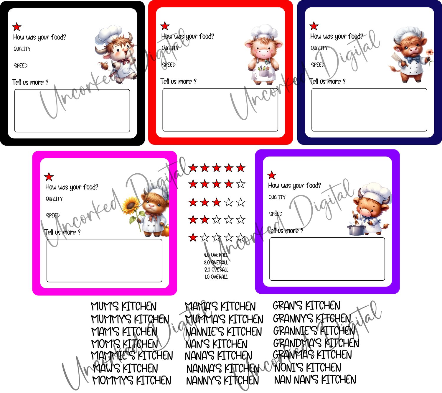 simple place the included titles, rating and stars onto the design or use your own text and font.