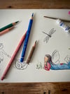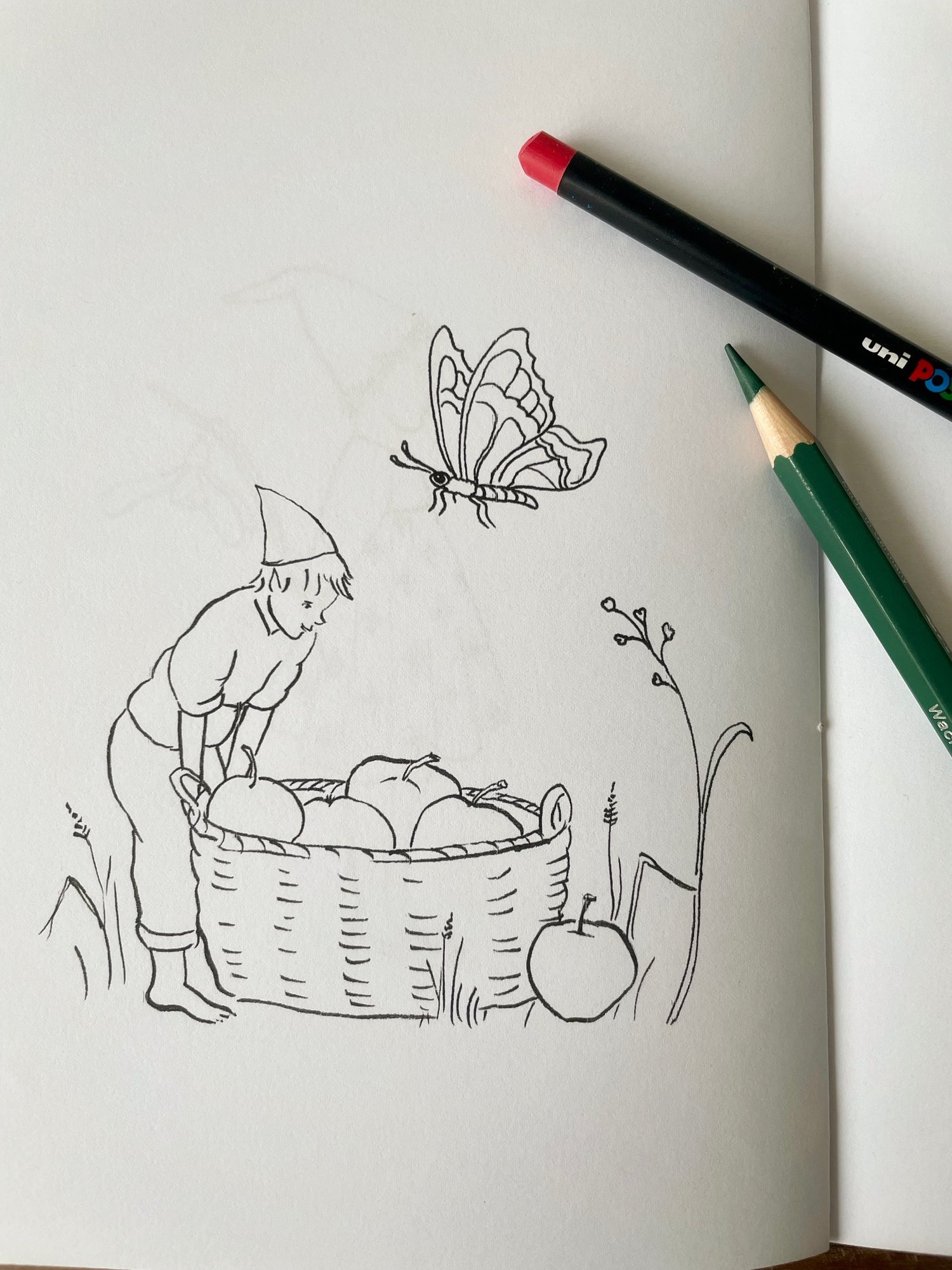 12 hand drawn colouring pages featuring elves, fairies and gnomes you can turn into a little booklet. The printable file consists of 7 double page spreads including a cover, which can also be used as single colouring sheets. For best results, I recommend printing the pages double sided, so that when you fold them in half to make the booklet, you have a picture on each side of the page. With this in mind, I have included a blank page in the file so that the rear of the cover illustration would remain blank when printed.