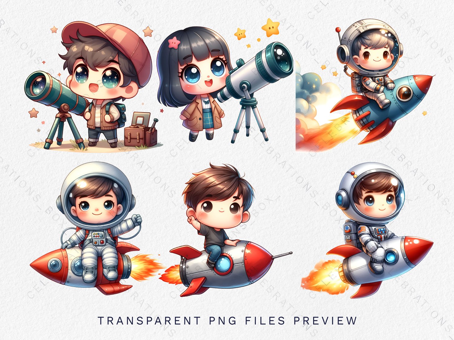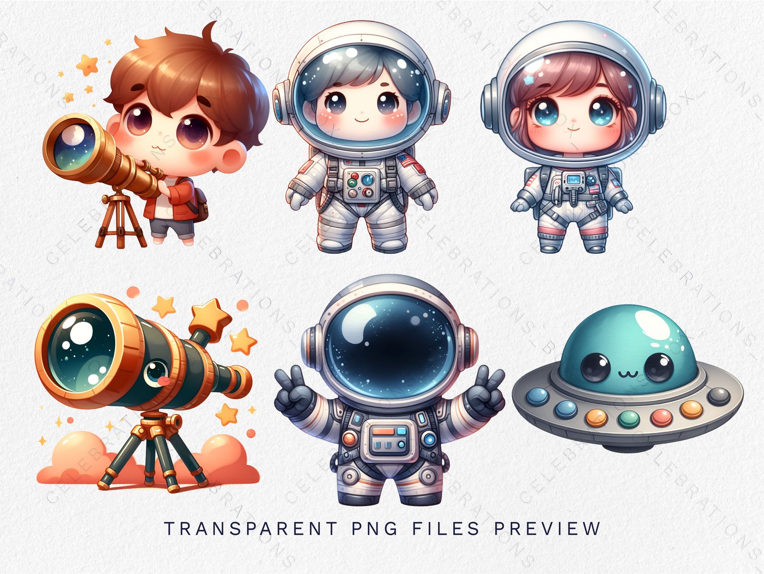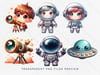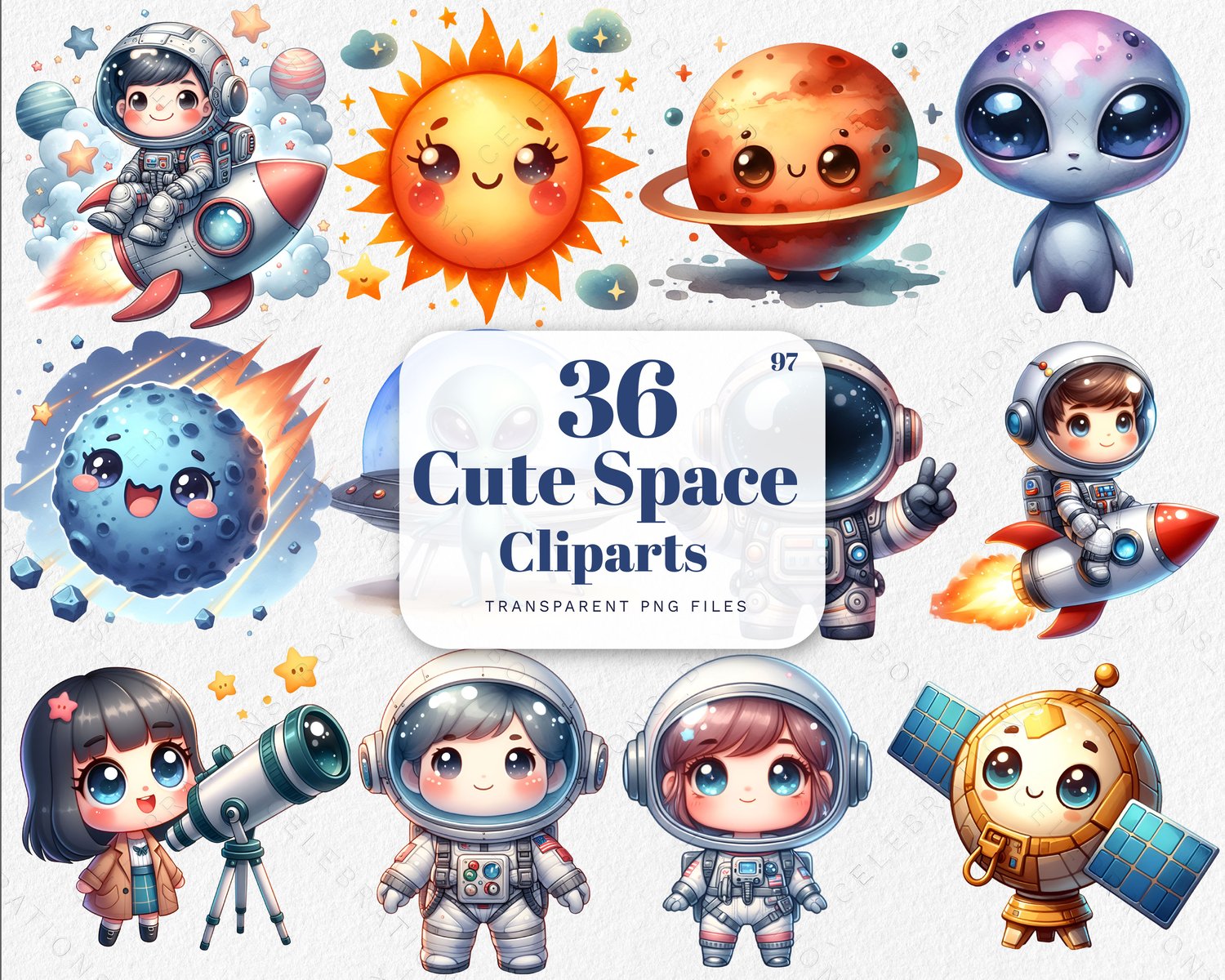 Immerse yourself in a celestial journey with Our 36 Cute Space Clipart Bundle. Explore the depths of the Galaxy with a Telescope from an observatory, or let your imagination take flight with a whimsical UFO soaring through the starry skies. And of course, no space adventure would be complete without an intrepid astronaut exploring new frontiers. Let your creativity reach new heights with this Cute Astronauts of watercolor Space Clipart.