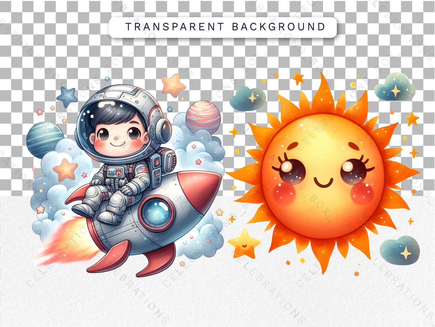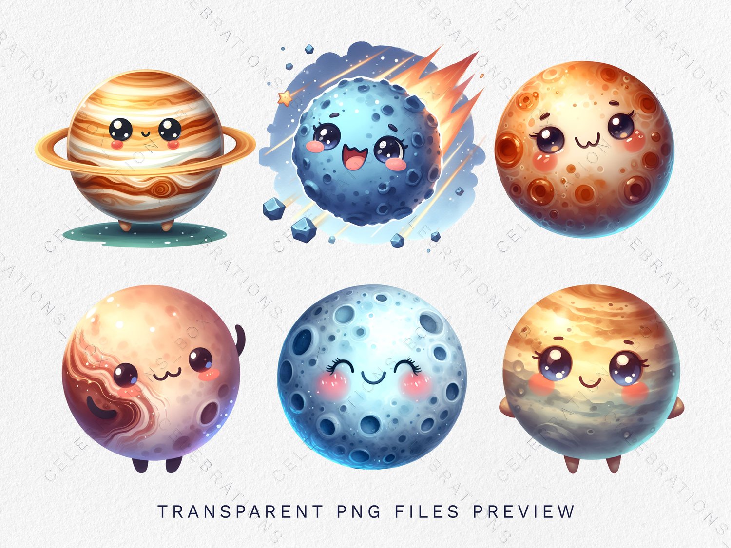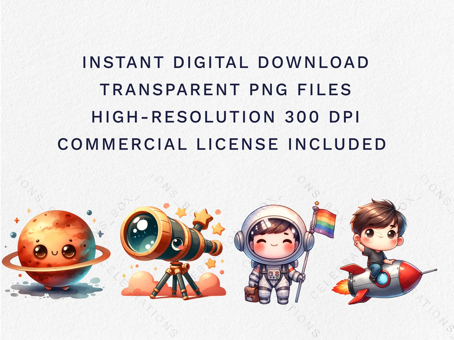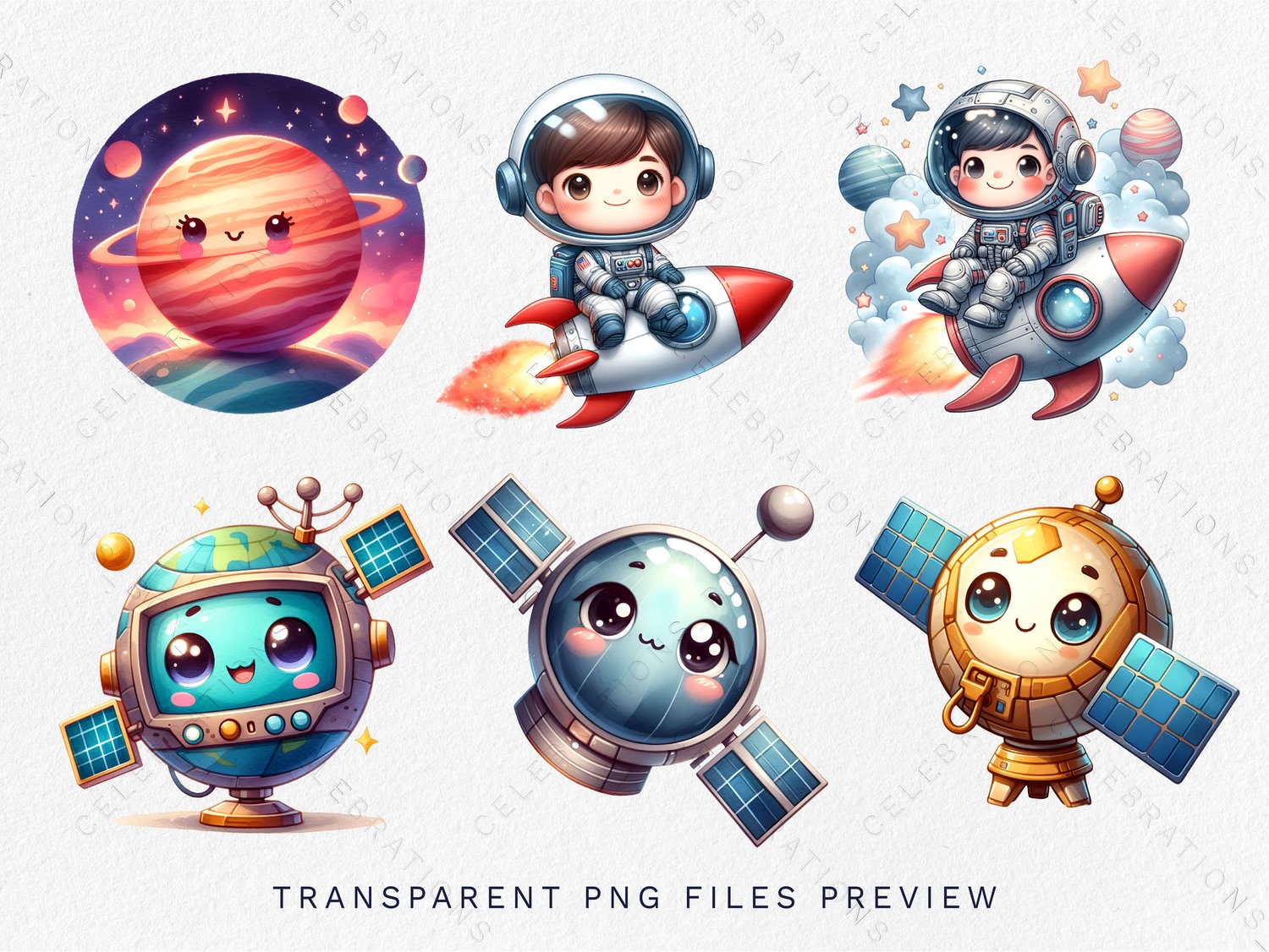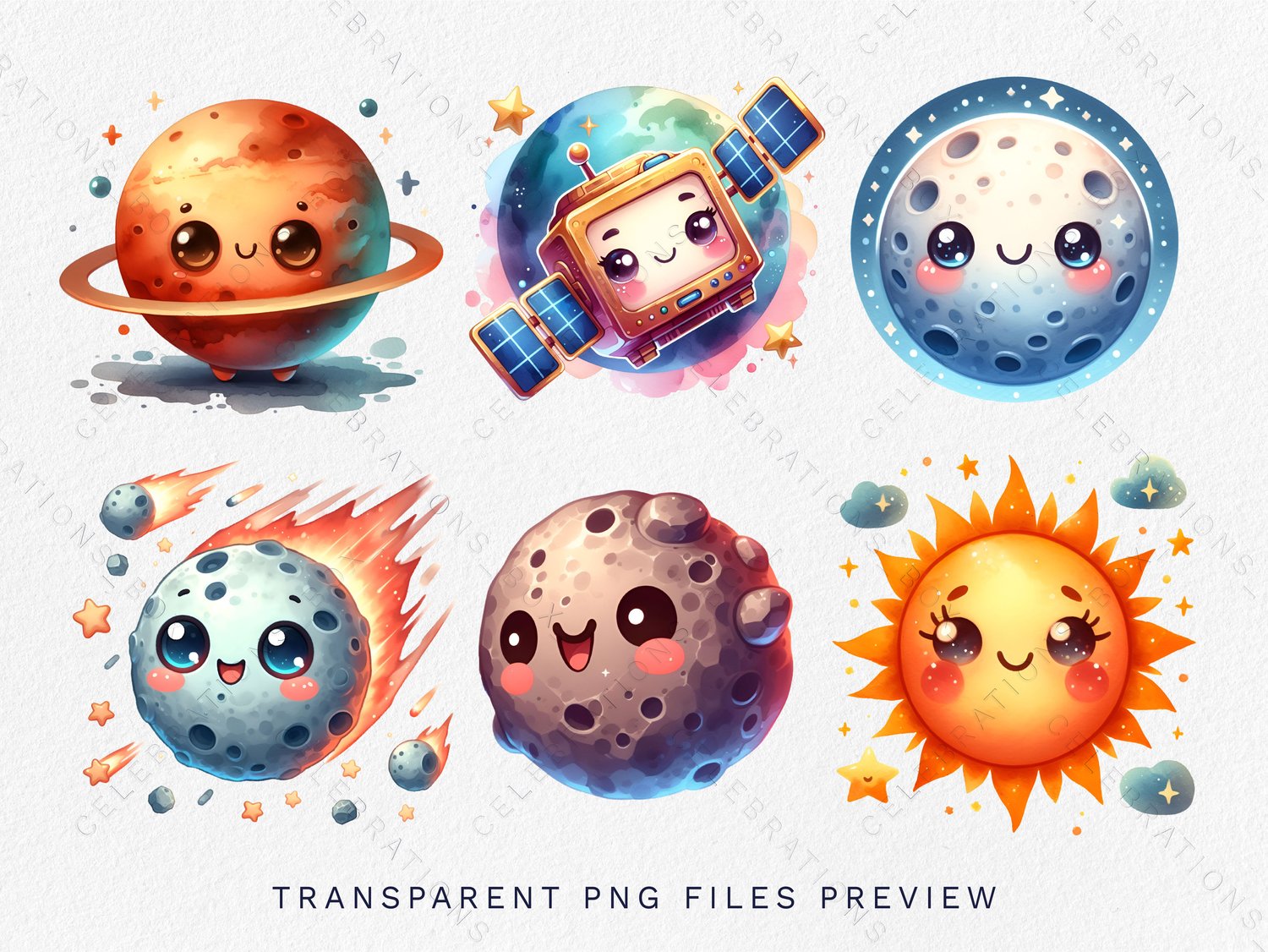 Our Cute Space Clipart watercolor png is easy to print and Perfect for greeting cards, party decorations, mug sublimation, t-shirt sublimation, invitation cards, cupcake toppers, junk journaling, stickers, scrapbooking, stationary, gift warp, embroidery, printed fabrics, poster, banner and so much more!