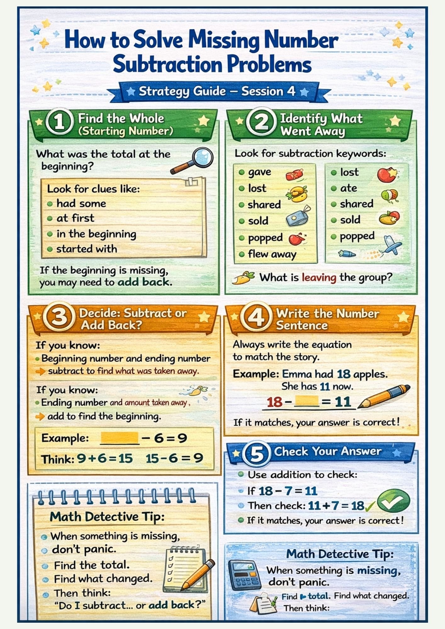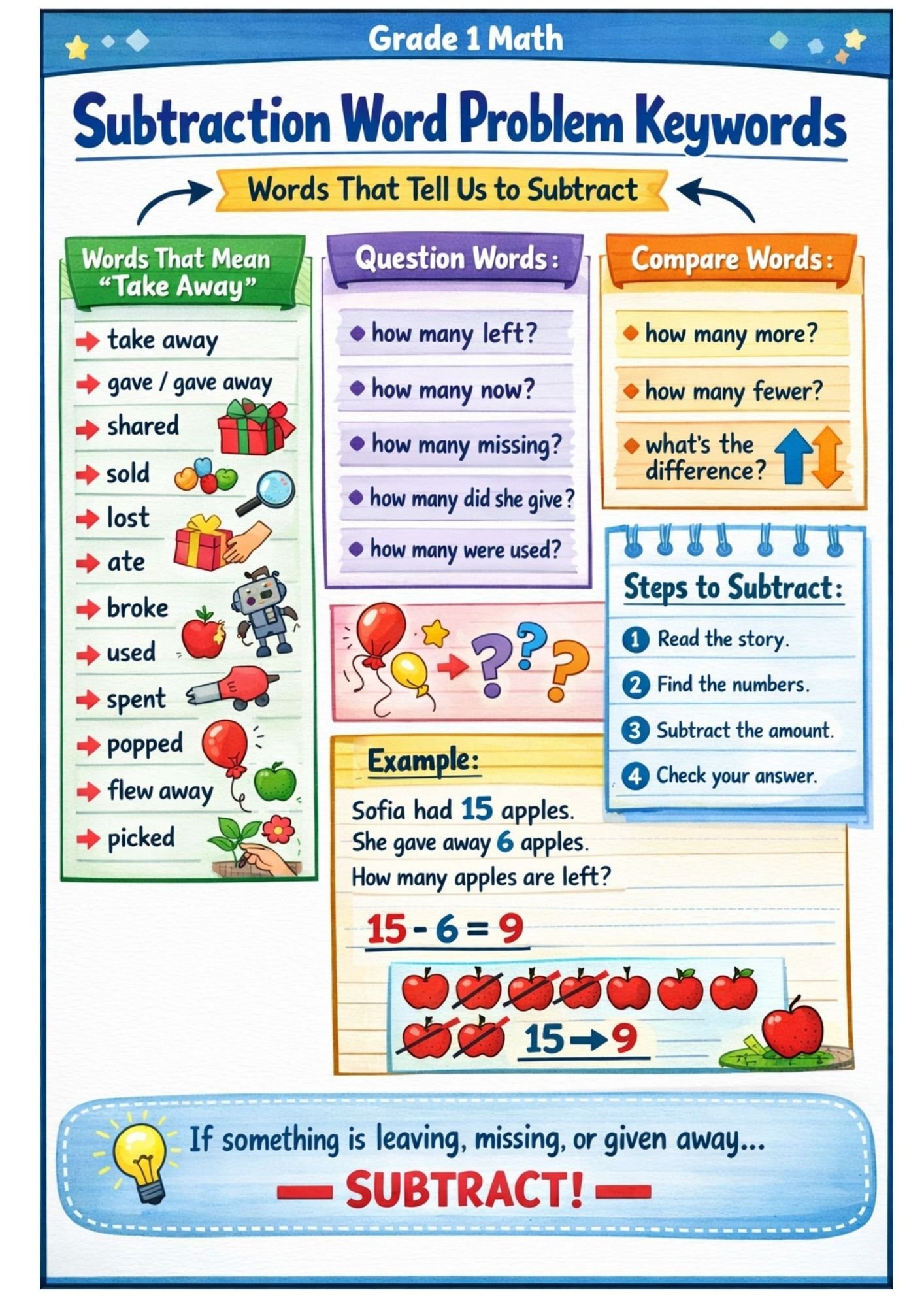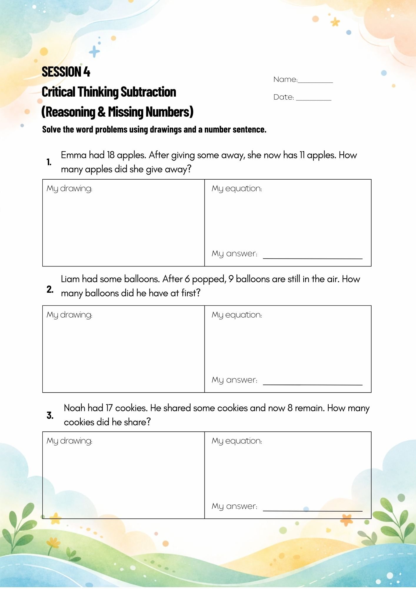 This printable Grade 1 subtraction word problem pack is designed to build confidence step by step — from simple take-away problems to higher-level missing number and reasoning questions.