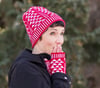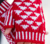 Two balls of River City Yarn’s Epic Yarn (100% wool) in two colours is all you need to make both the hat and a pair of mittens. Our sample is pictured in 500 Royal Red and 300 Snow.
