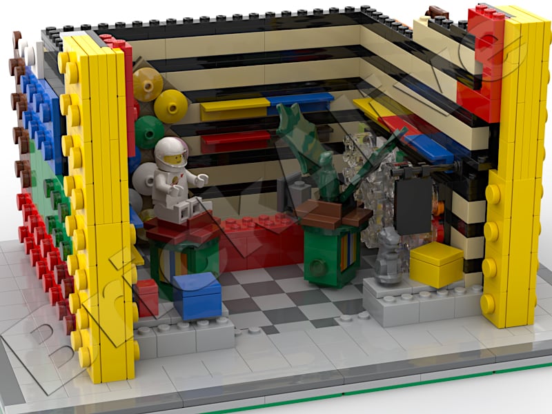 The model totals 1 729 parts, the interior is fully furnished with multiple shelves, a brick wall, two models on display (a cosmonaut and a dragon), a counter. The interior is very easy to access thanks to the removable roof. No stickers in this model because the BLOCKO STORE sign is written directly with lego pieces!