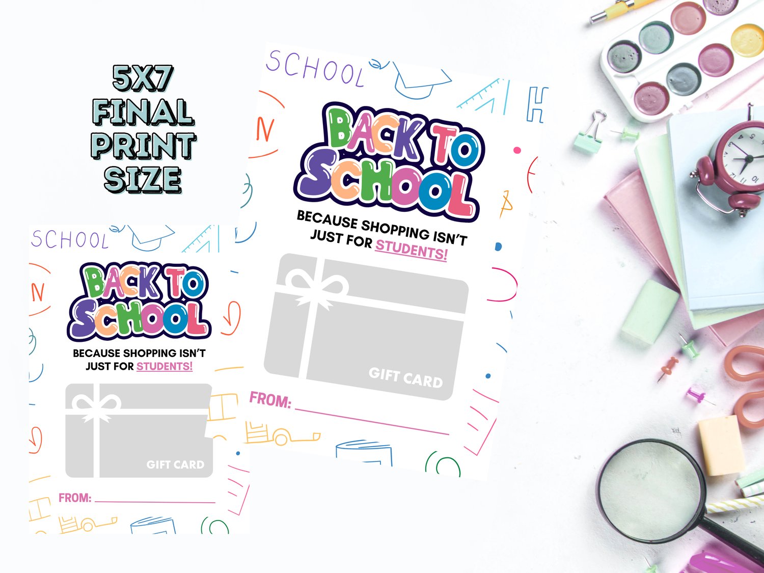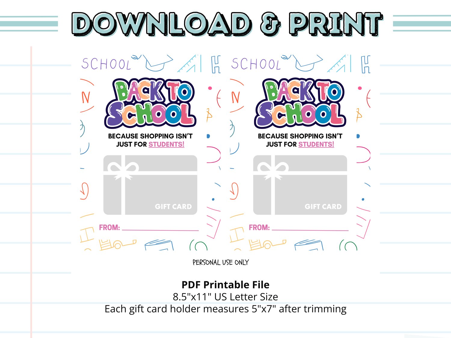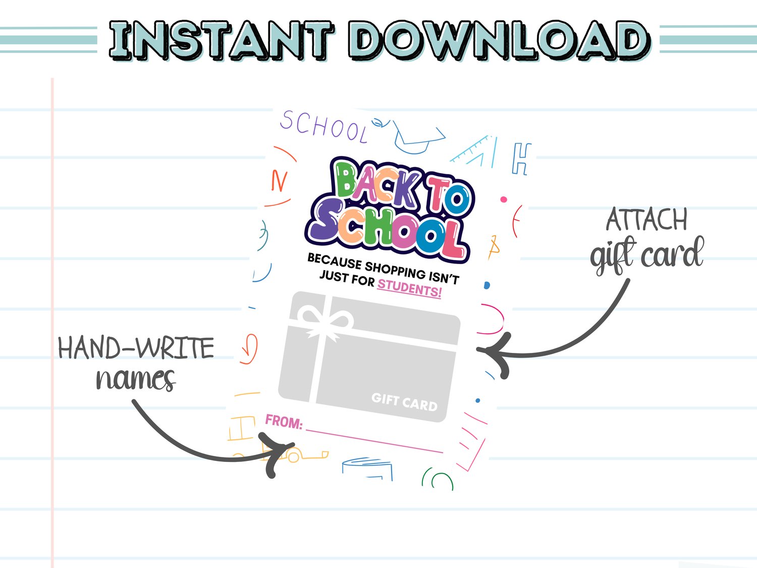 This printable design features bold colors, doodle-style school icons, and a cheeky message that’s perfect for welcoming staff, teachers, and school heroes. Because shopping isn’t just for students—add a gift card and spread some cheer!