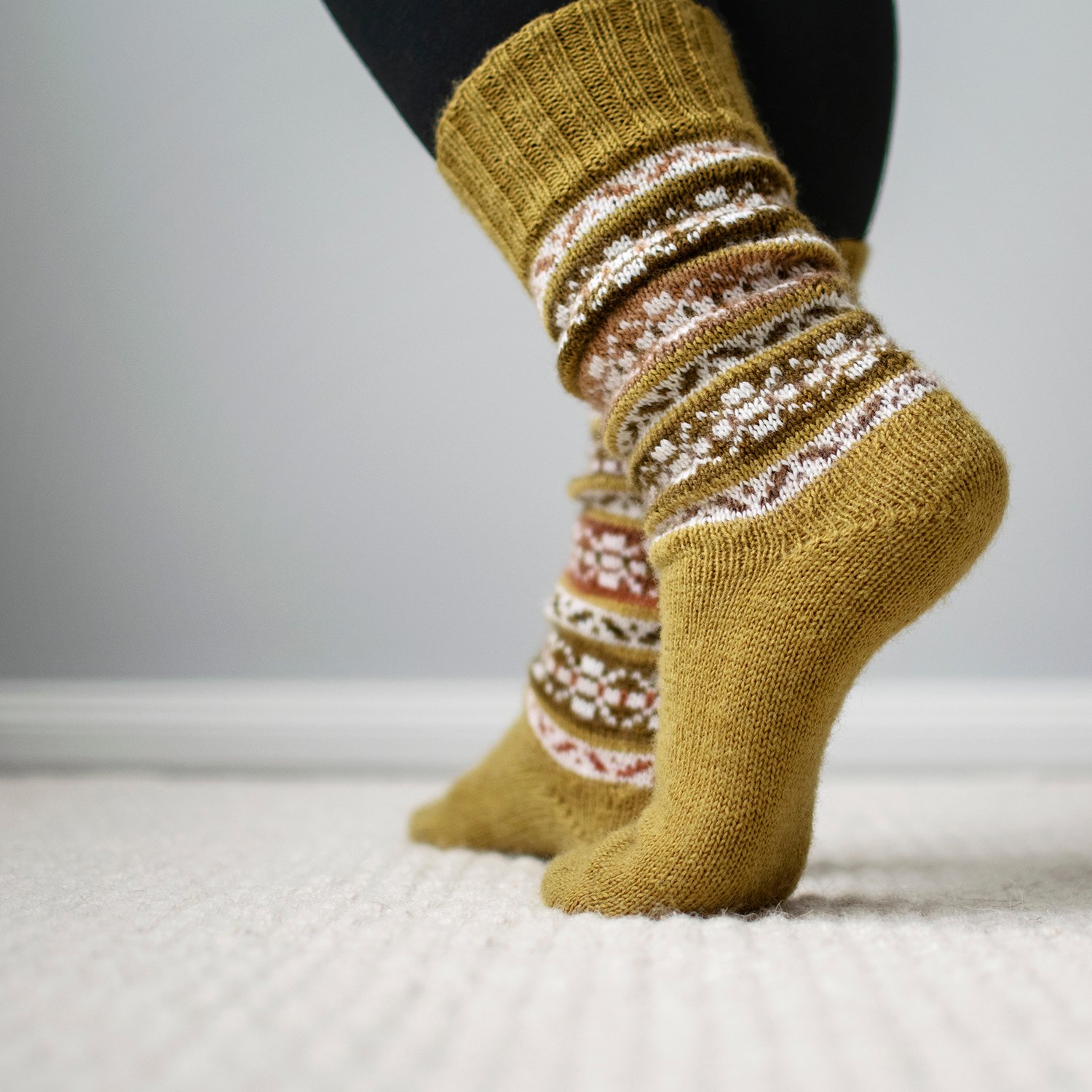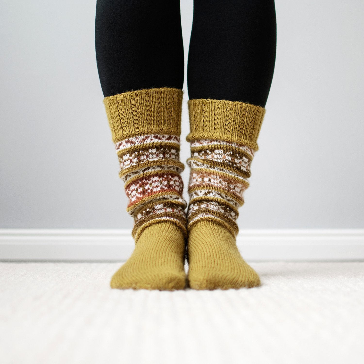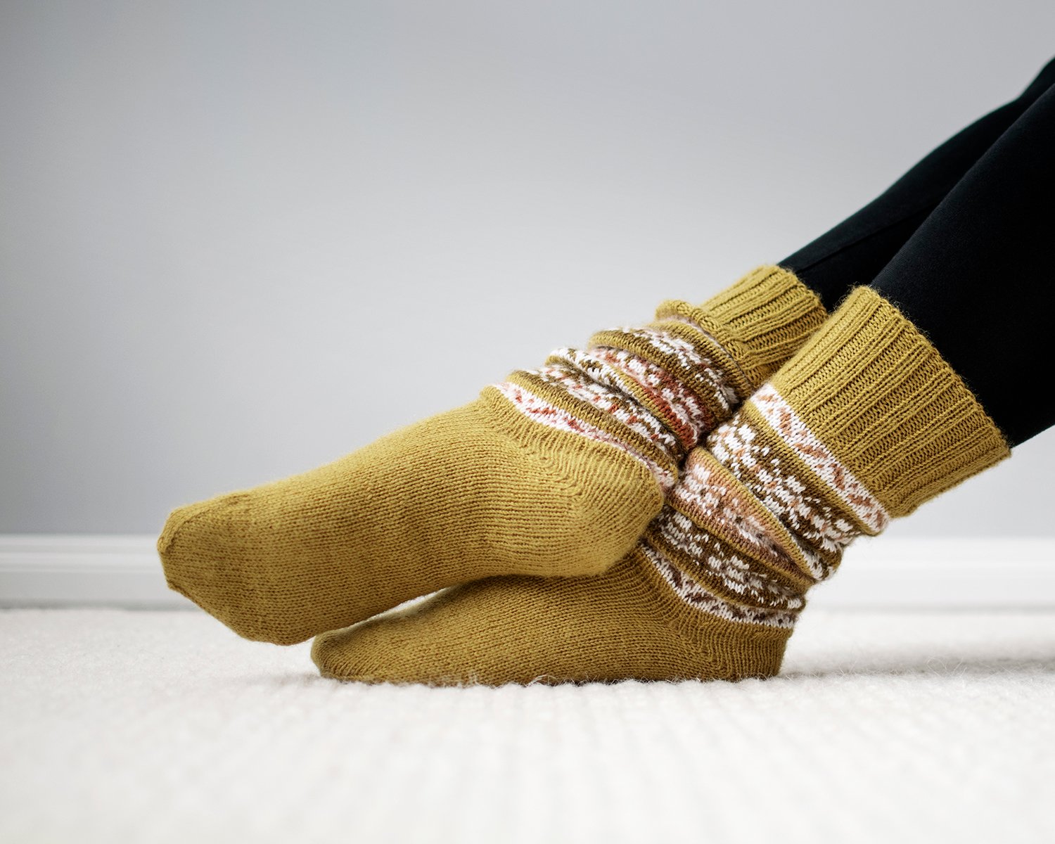 These cozy socks are worked from the top down, with a slightly wider, striped colorwork leg, and a single-colored foot with a short-row heel.