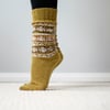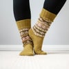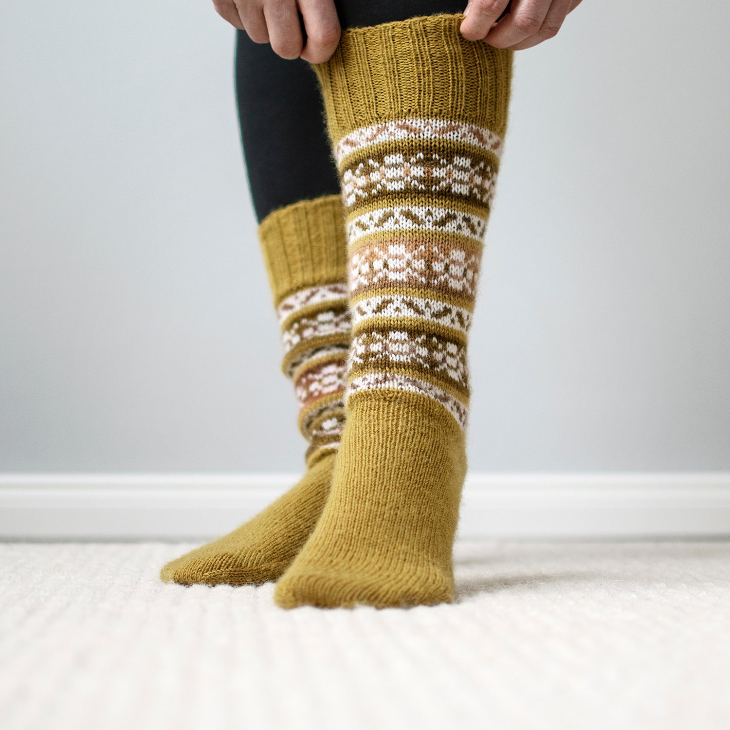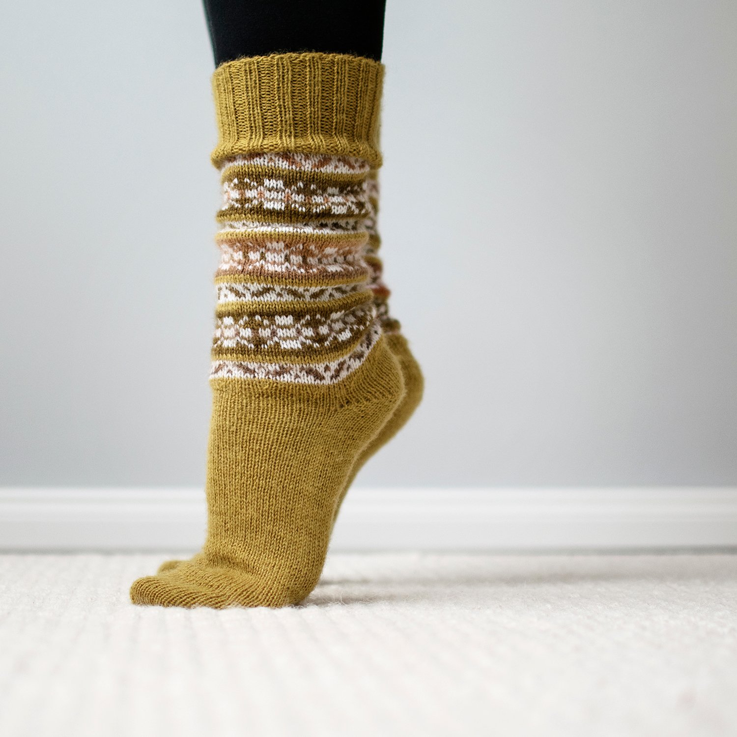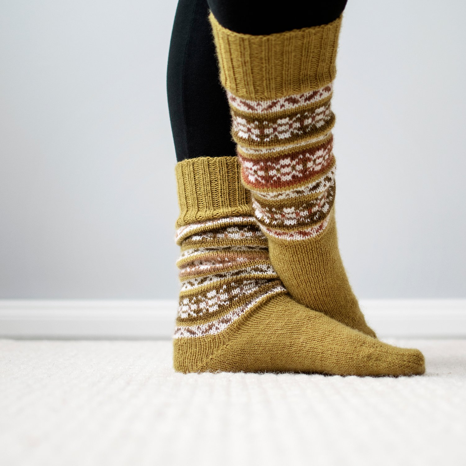 These cozy socks are worked from the top down, with a slightly wider, striped colorwork leg, and a single-colored foot with a short-row heel.