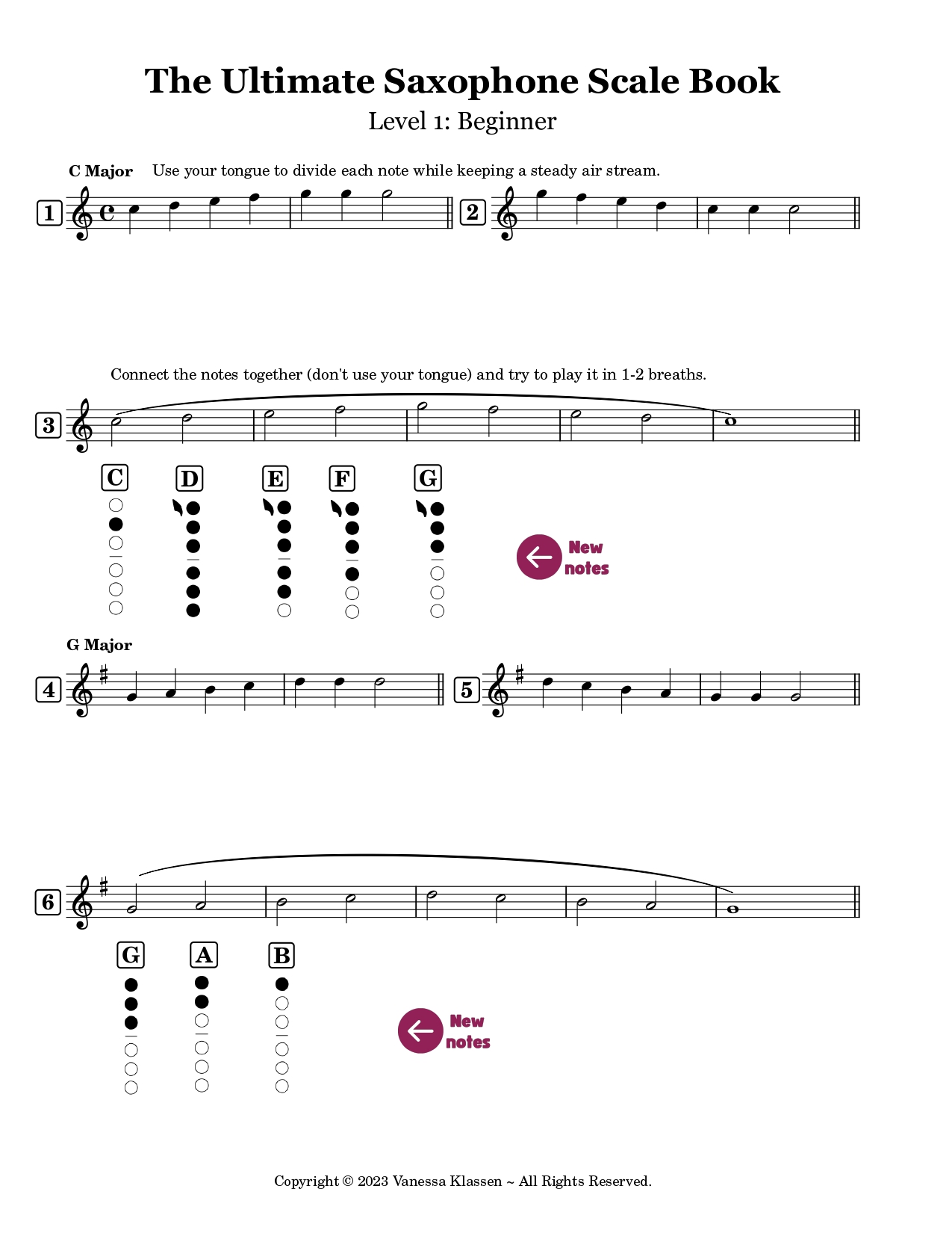 - tongued and slurred exercises using quarter notes, half notes, and whole notes