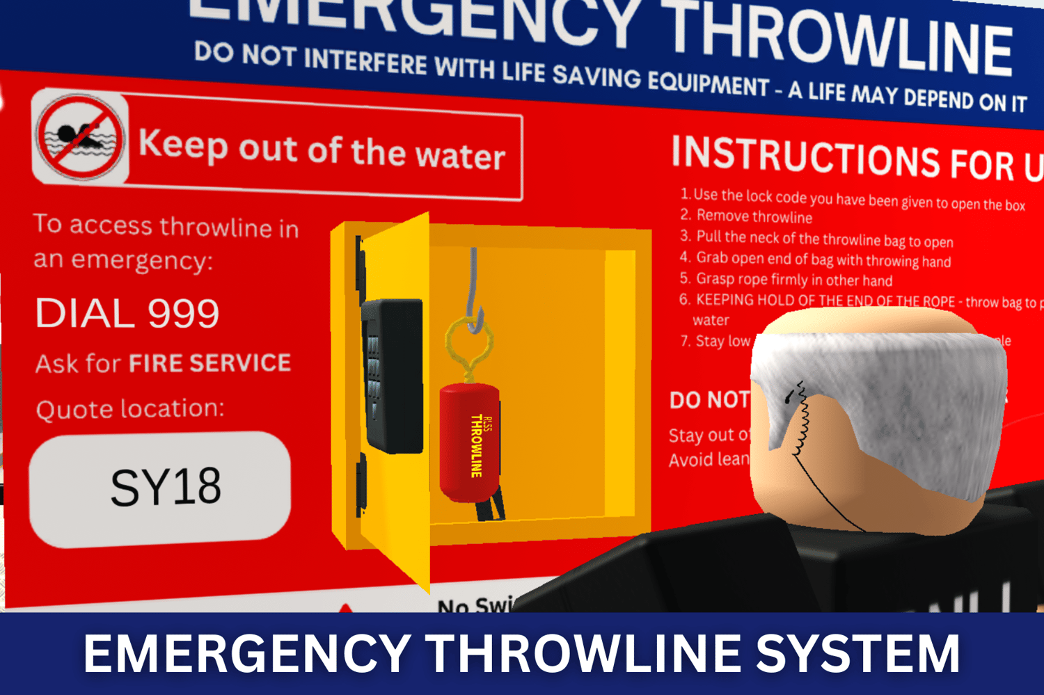 This is a cool emergency throwline system based off the real-life boards around the UKs open water, used to rescue individuals who are drowning when no emergency services are present. This system includes: