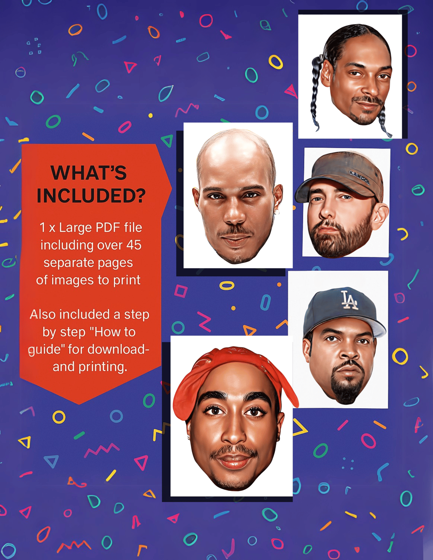 - 1 PDF File with 45+ pages of printable Hip Hop heads