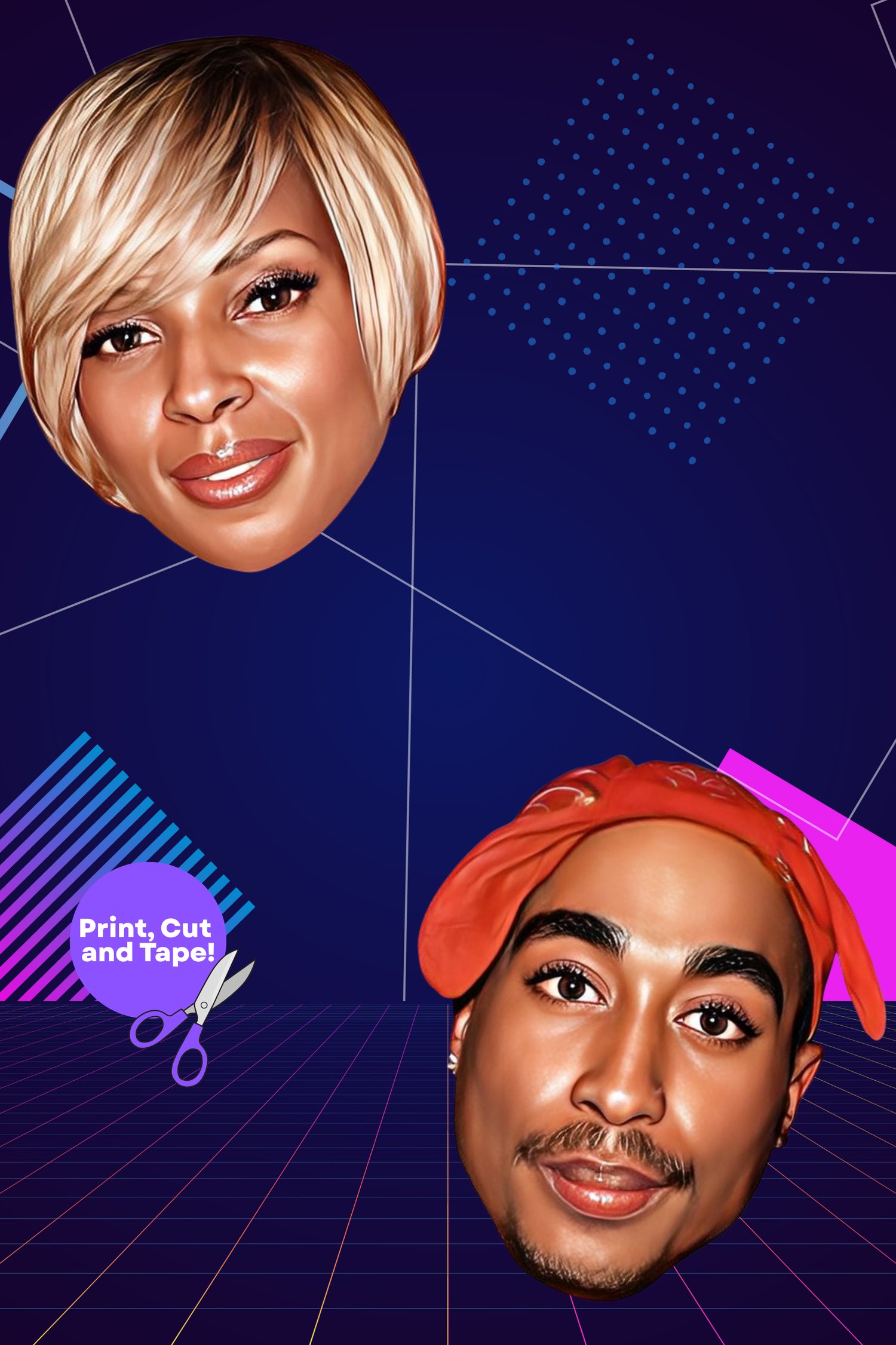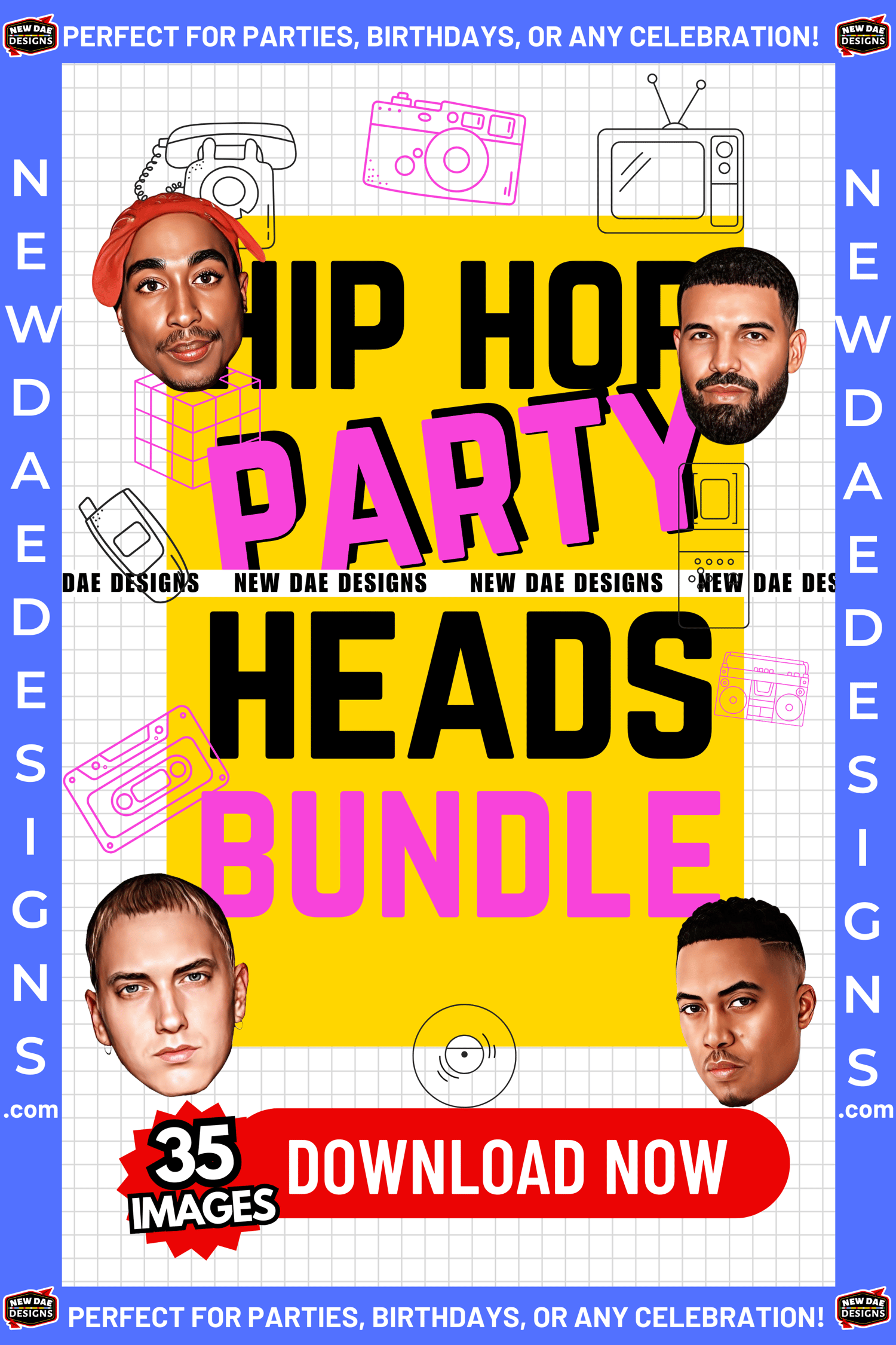 Bring the energy of hip hop legends to your next event! Our Hip Hop Party Heads printable pack is perfect for birthdays, house parties, photo booths, music events, or just having a blast. Featuring iconic hip hop faces styled for fun, retro party vibes, these cutouts are designed to get laughs and spark conversation.