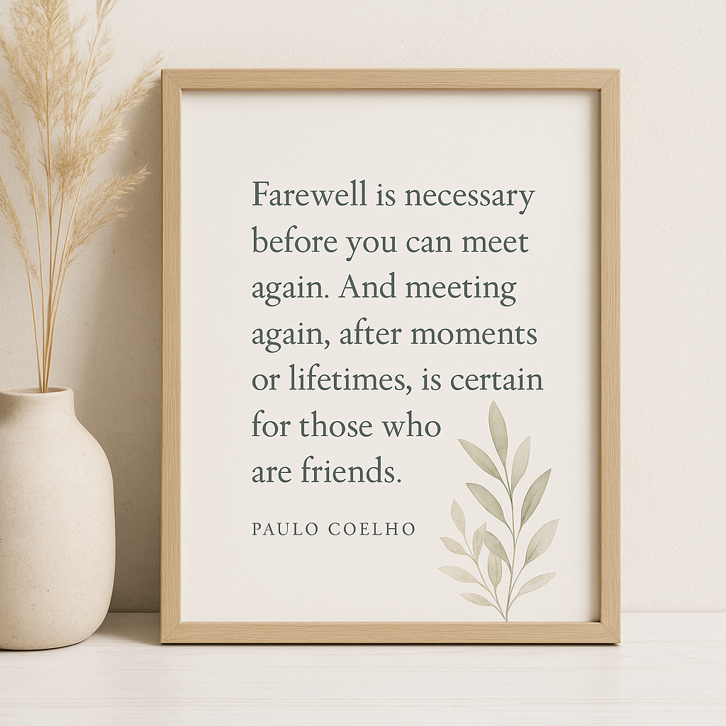 This beautiful free printable features an inspiring quote by Paulo Coelho, reminding us that even the hardest goodbyes can carry the hope of reunion.
