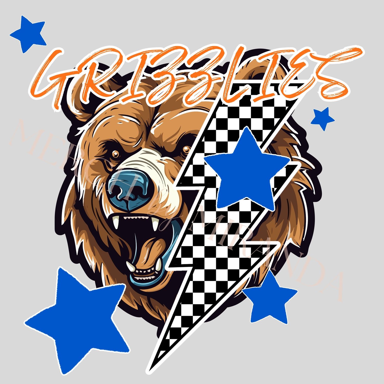Grizzlies Mascot Orange and Blue | Sublimation Design | Digital Download | School Spirit Shirt PNG | DTF Design | Lightning Bolt-Checkered with Stars - Grizzlies