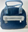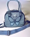 This medium-sized (10”x8”x3.5”) bowler styler bag will stand on its own. It features a dual-toned, machine appliquéd butterfly on the front panel. There’s a zipper pocket on the back with a silver faux leather overlay accent. The blue and silver zipper closure has dual pulls (one is a butterfly).
