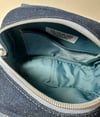 The interior is made with a dusty blue water-resistant canvas. It features a zipper pocket and denim slip pocket.