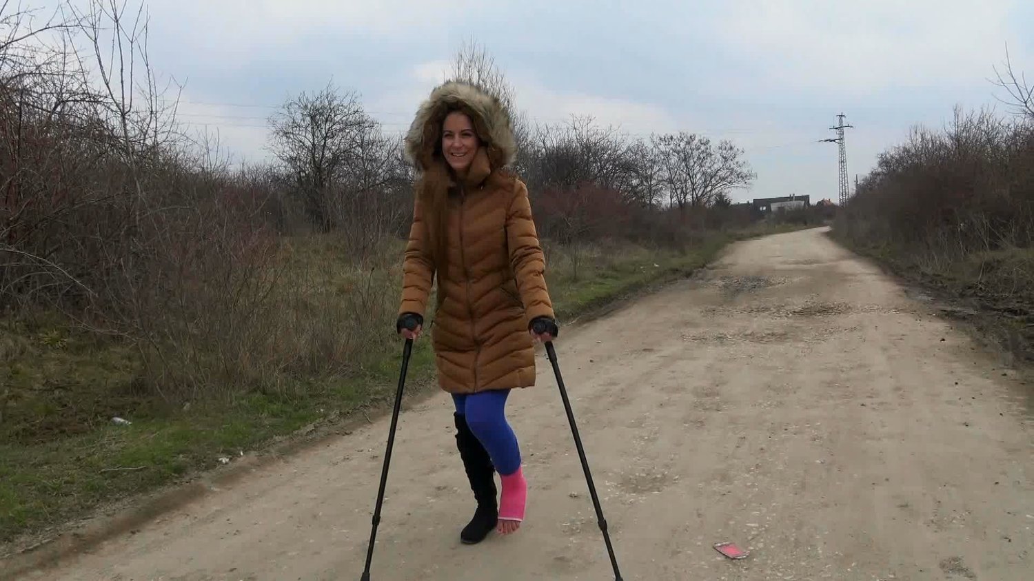 Bree has a pink long leg cast on her left leg but it is difficult to see it as she has long trousers and has a small sock over her toes.You can see it more clearly when she crutches along the road and her legs are completely stiff.After a while Bree takes off her sock and we then get easier to see her cute little toes sticking out from her long cast.