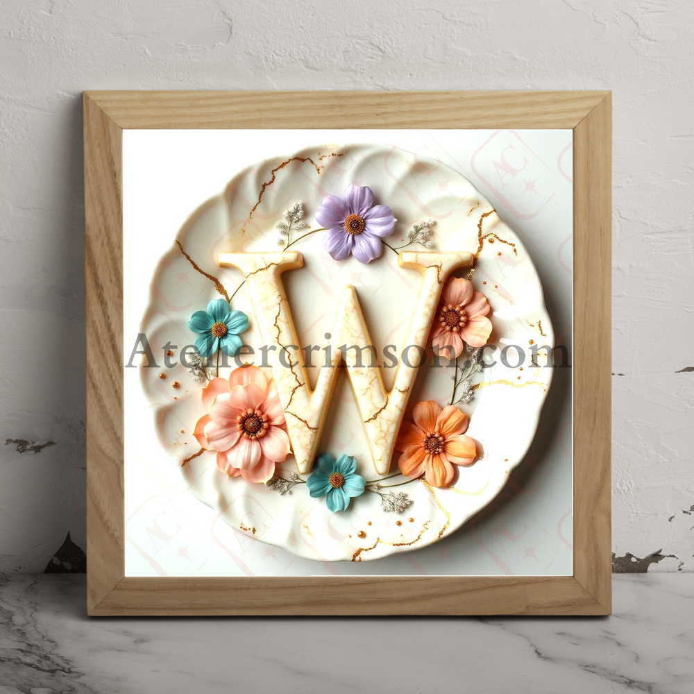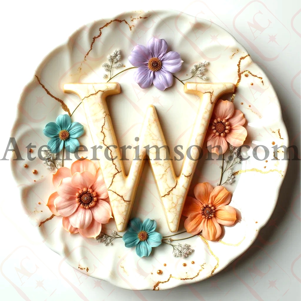 The letter W flowers and procelaine .Download Now this high quality AI-generated image, perfect for adding a touch of tranquility and creativity to any space.