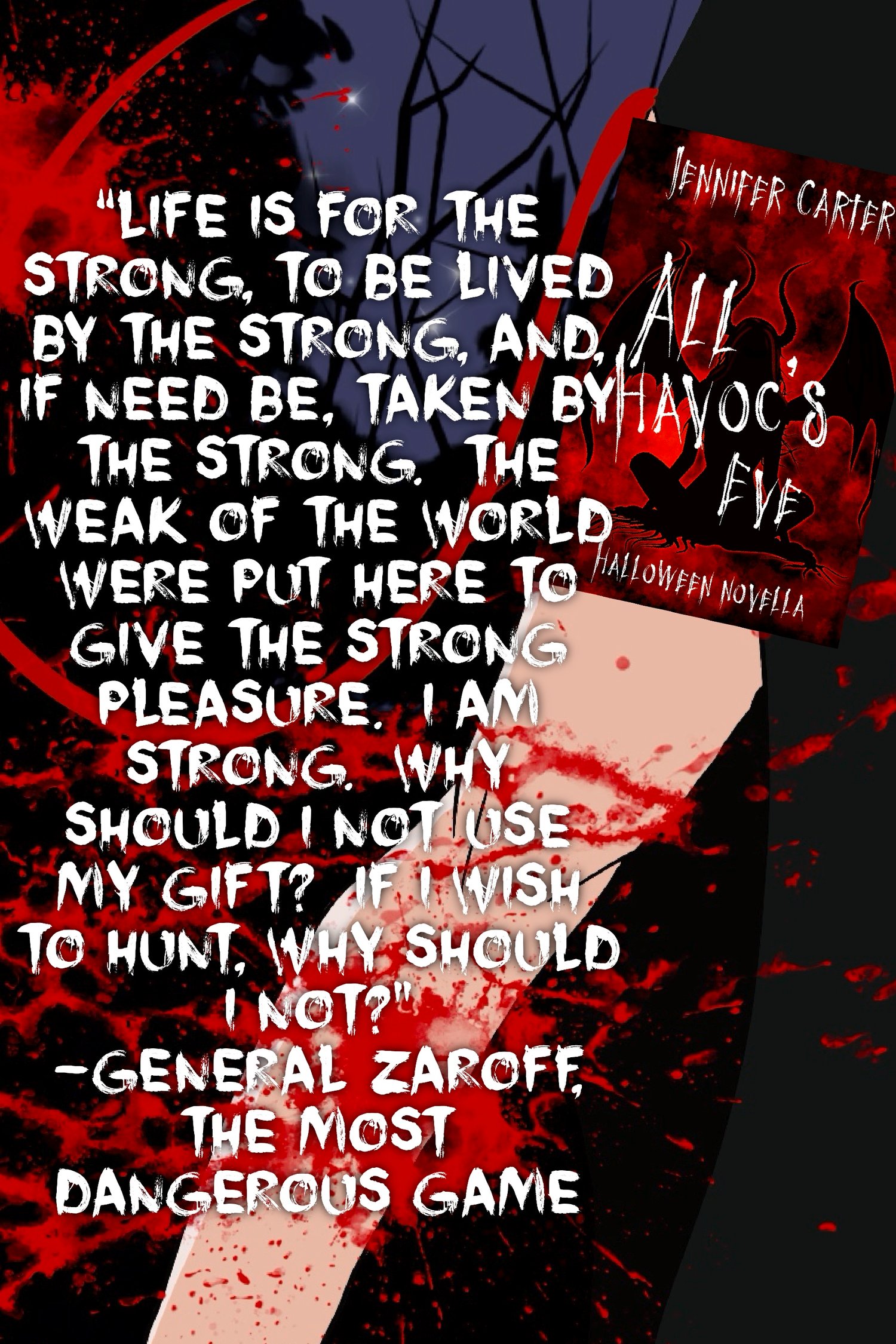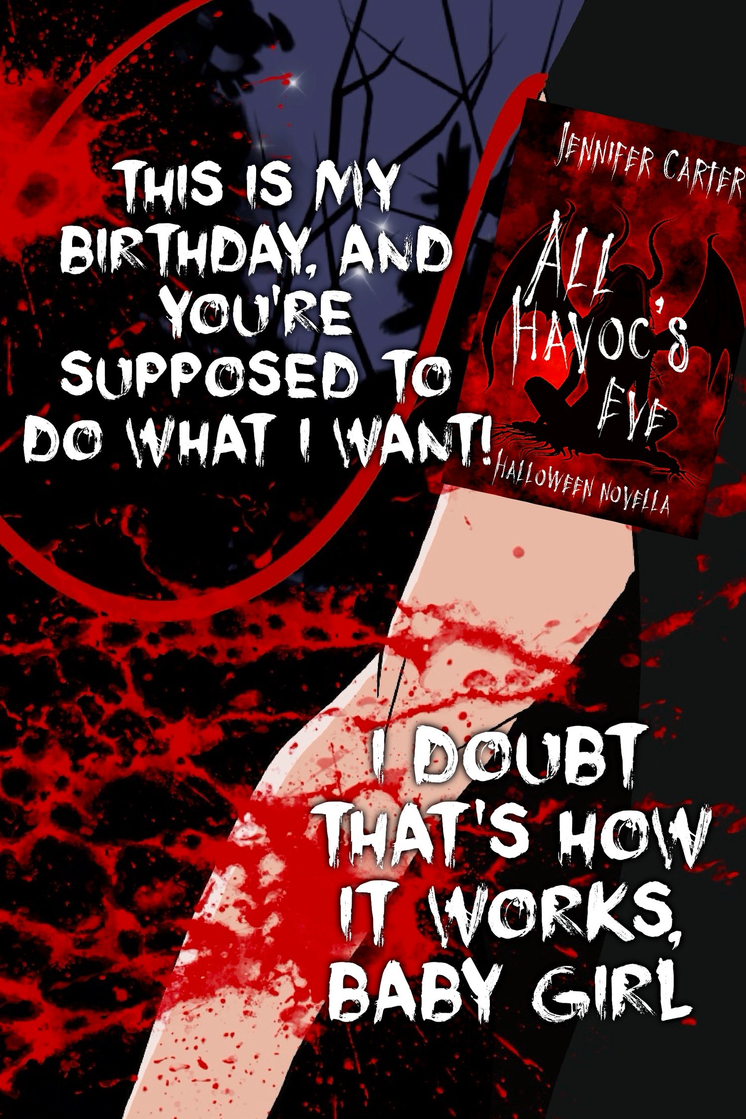 All Havoc's Eve is a standalone novella of a reimagining of the most dangerous game. chalked full with a polyamorous relationship (why choose), monster romance, dark humor, gore and of course, bratty vibes.