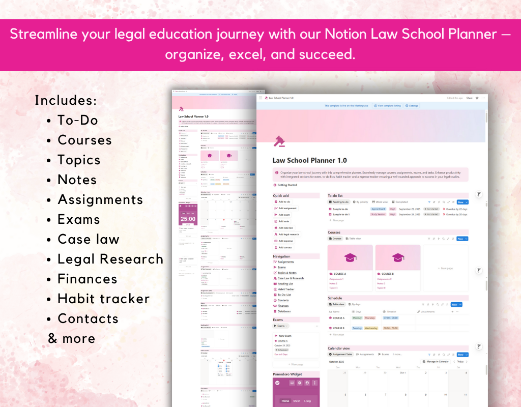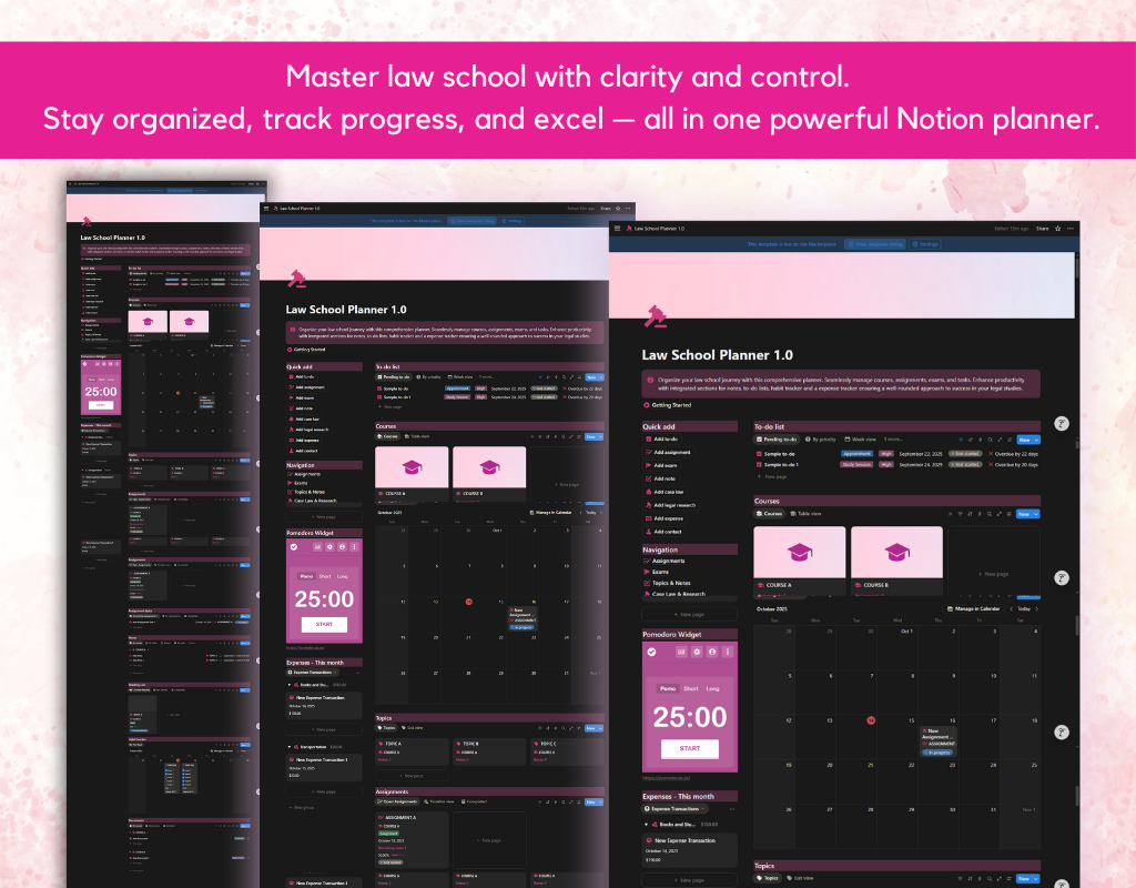 The Law School Planner is your all-in-one Notion workspace designed to help law students stay organized, productive, and in control of their academic journey. Customize it easily by removing placeholder data and tailoring it to your unique needs.
