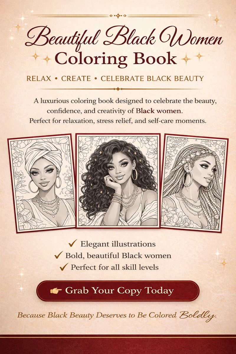 Celebrate beauty, creativity, and self-care with the Beautiful Black Women Coloring Book — a thoughtfully designed collection created to honor the elegance, strength, and individuality of Black women.