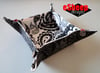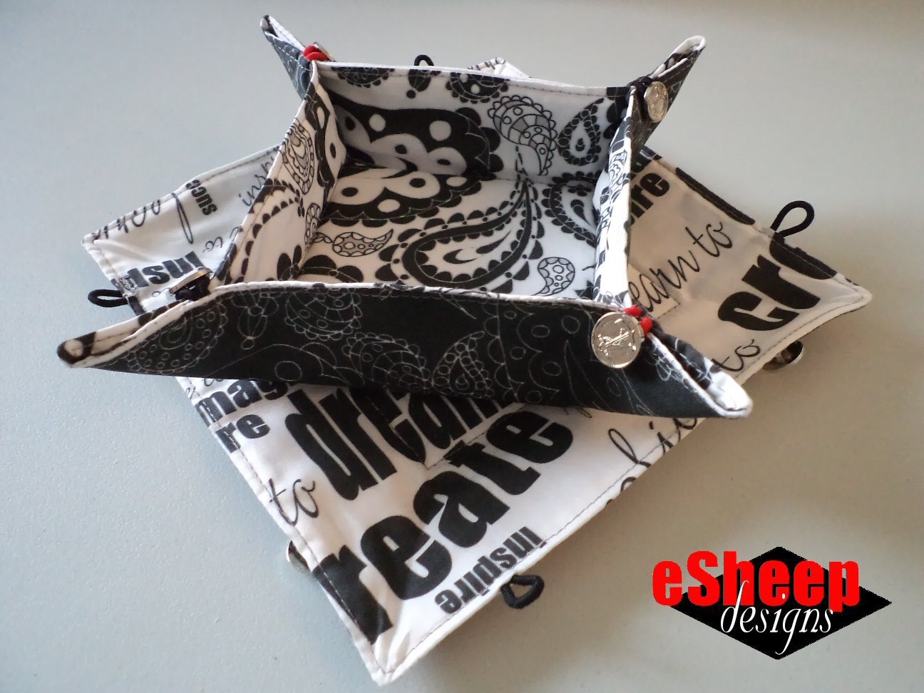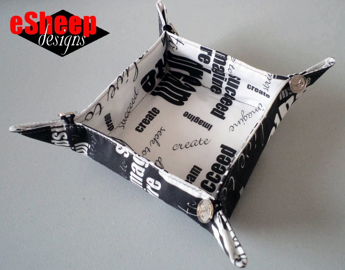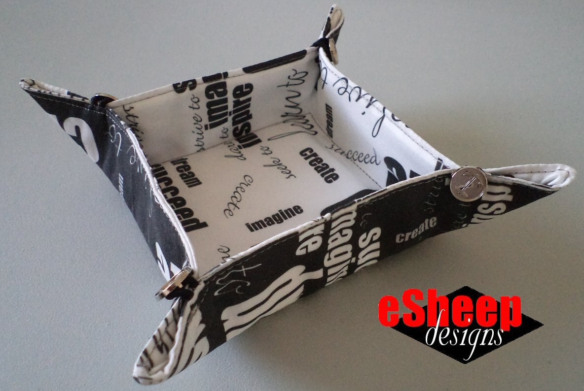 This is actually an "upgrade" from one of my earliest tutorials, the Cutting Corners Collapsible Travel Tray (for which a PDF is available if you go to my blog). But you've likely seen variations of this sort of tray, made out of a square. This one has the advantage of being collapsible for easy storage in your suitcase, via the elastic loops and buttons at the corners. It's also a great scrap-busting project!