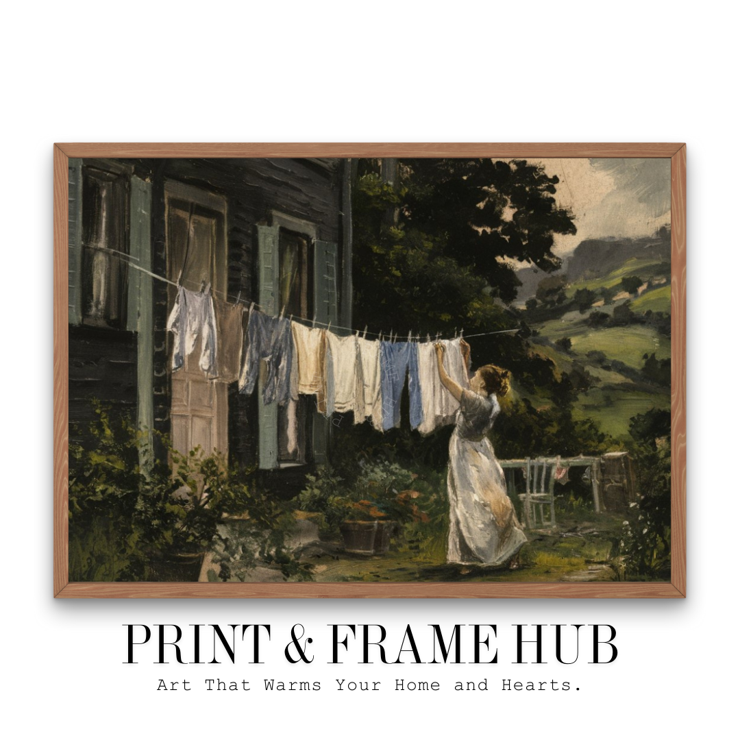 This painting captures the simple beauty of a woman hanging laundry on a line in a picturesque countryside setting. The serene landscape and rustic charm make it an ideal addition to your wall decor, bringing a touch of tranquil, everyday life into your home.