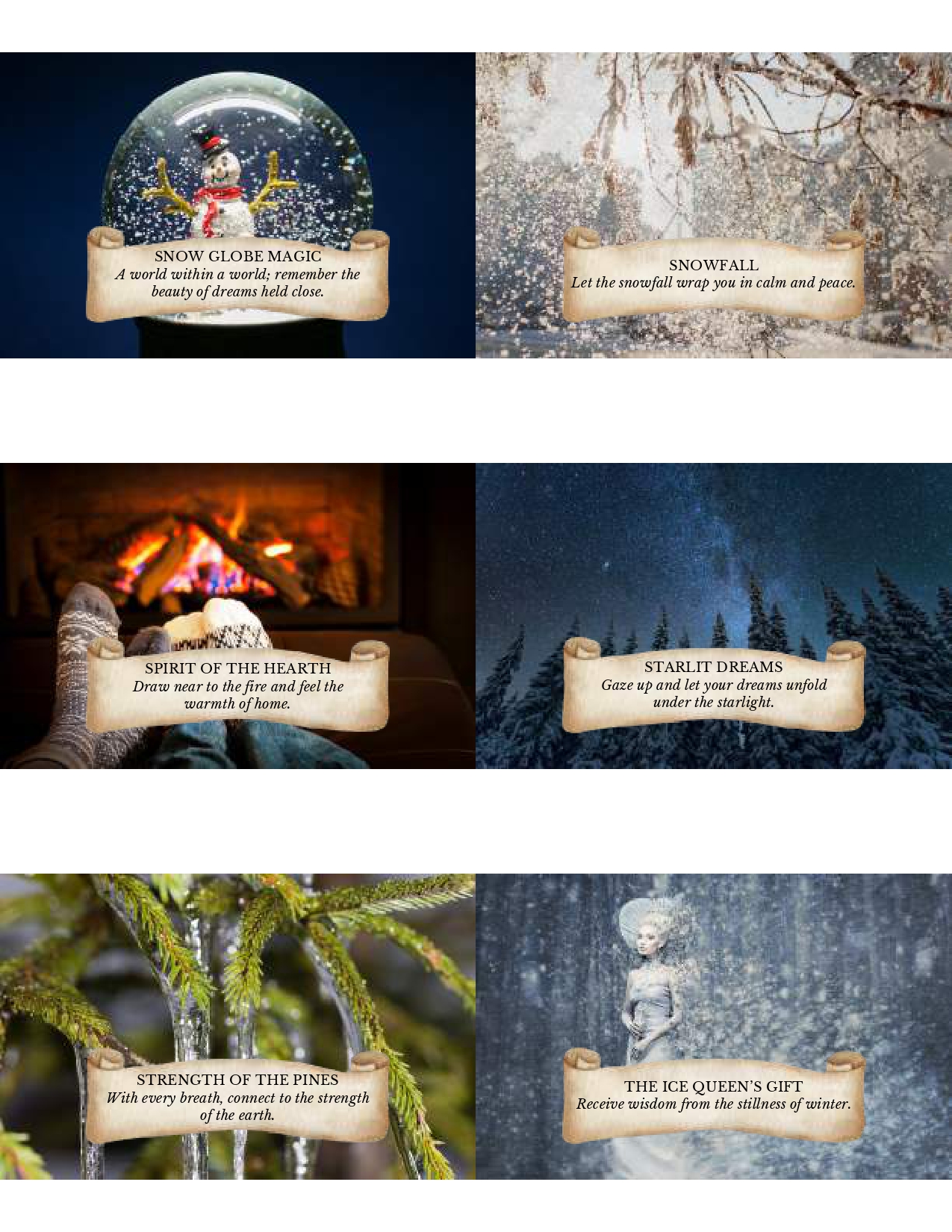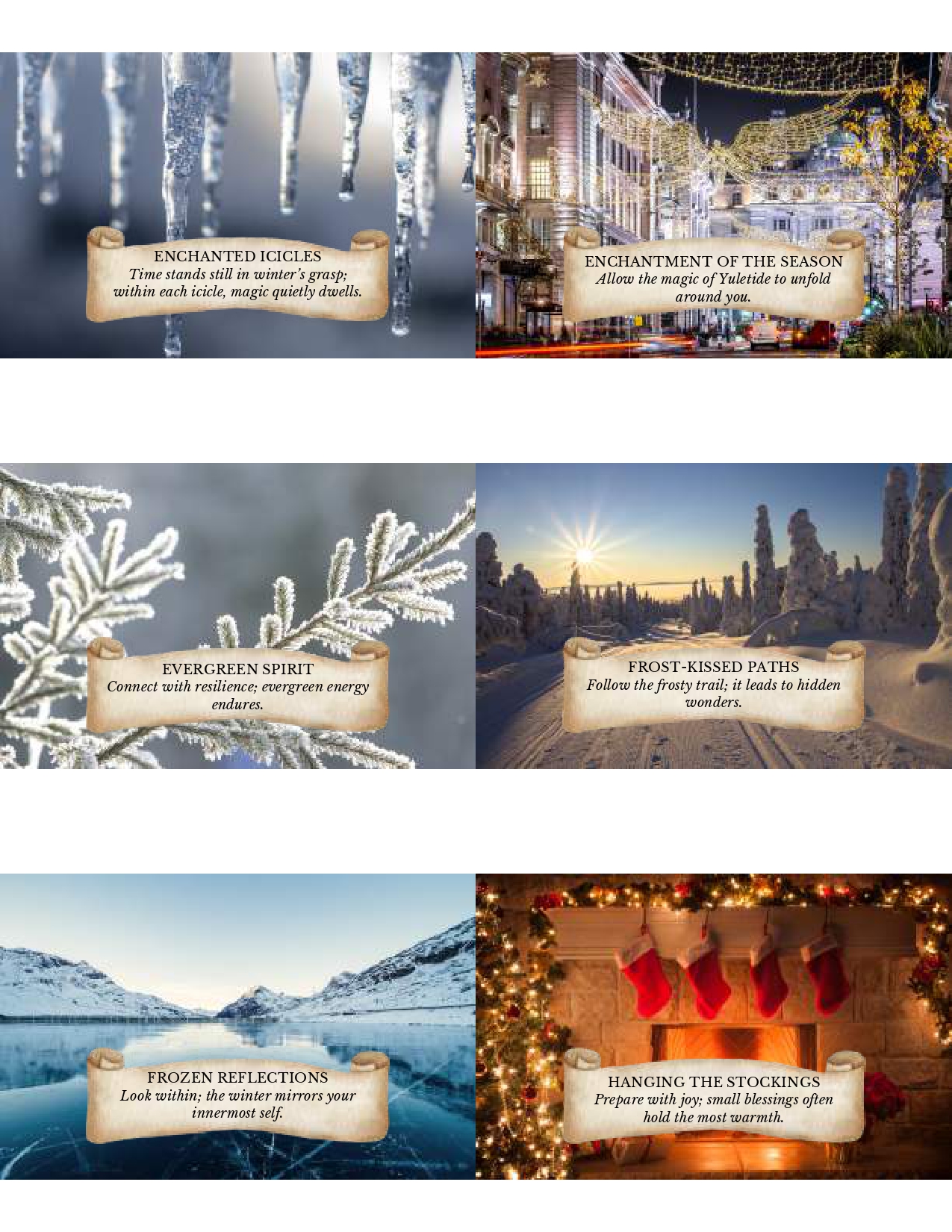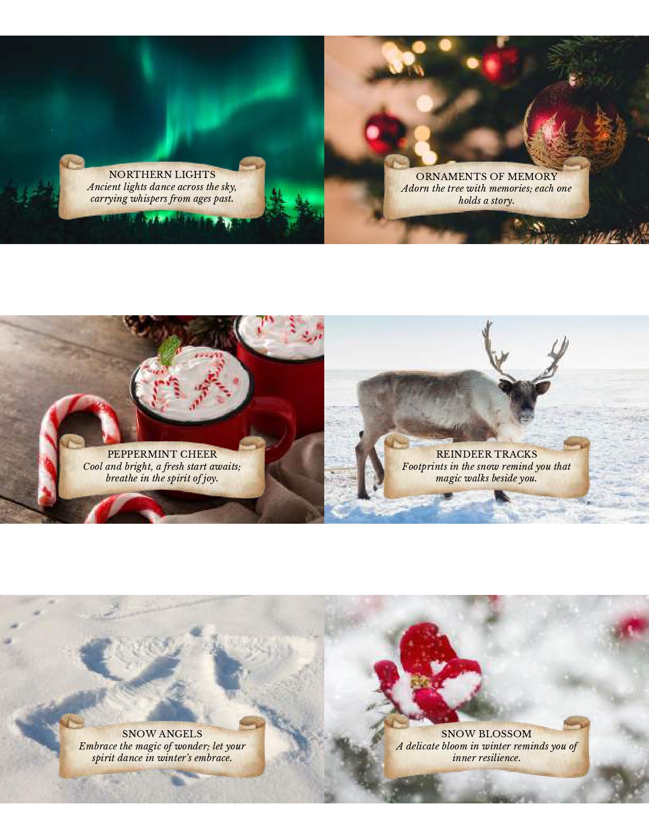 You can use the cards in your Christmas themed oracle card readings, or as journaling prompts.