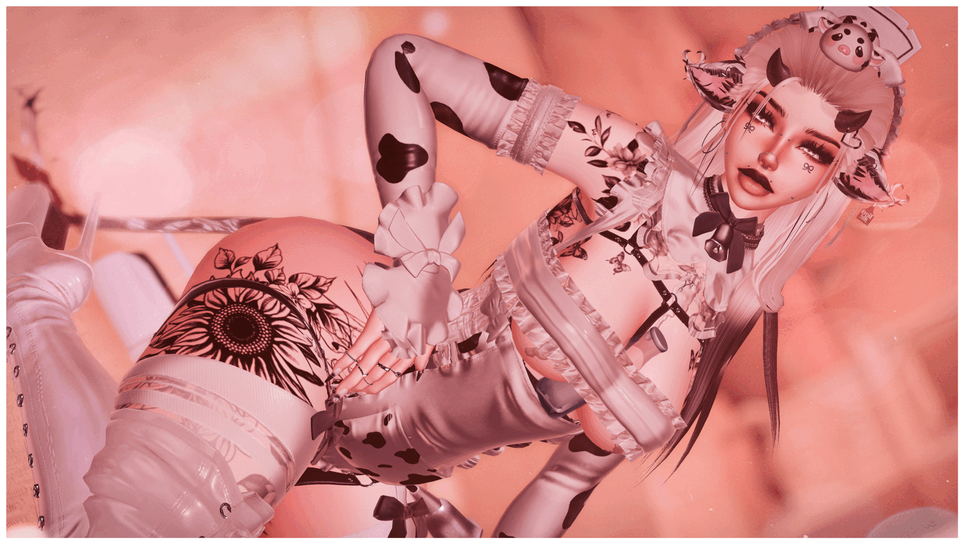 Body Zinpia Sculpted by me no reuse, Head Sculpted by me no reuse + Service set (full set) + HxnnyBUN set (collar) + CvntBOOTS + Penny hair + Athena hair Nessy, Sunny hair, Kamilla hair, Nora hair, Heyume hair baby hairs Saikura, Maid outfit, Ankle chain Soshi, Arm cuffs + boob tube + waist harness aresvr, Kawaii E-girl set (Skirt, sweater, choker, body piercings) Vinuzhka, Milk maid set Meeva, Reverse bunny suit (corset) The after dark boutique, Boob milk + hand bell Sezzy♡ (Commissioned), Maid headband yamuVR, Goth Milk, Locked up heels TheThiccWitch, Glasses ChocoBunny, Cow plushie LittleSaku, Nails nyaowoh, Toe nails yaoomi, Rings PinkRaccoon, Face gems Skulli, Necklace B o o#8584, Earrings Aantara, Wheat DittyDos, Pastry ZenifyyVR, Body milk torinyan, Tights aresvr, Tattoos Sunshine France texture, Eye texture Mooshi Art, Eyeshadow Jvliette, Cow follower novapies. Butt spank, SPS Wholesome, GOGO Frandavrc, Fake index Snoww, Icons Maddiiee.