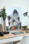 This striking image showcases a modern building with an organic, flowing form. The facade is punctuated by a series of unique circular windows of varying sizes, creating a dynamic and eye-catching design. The smooth, sculpted surfaces and rounded edges give the building a sense of fluidity and movement. This image was created using AI as a visualization tool.